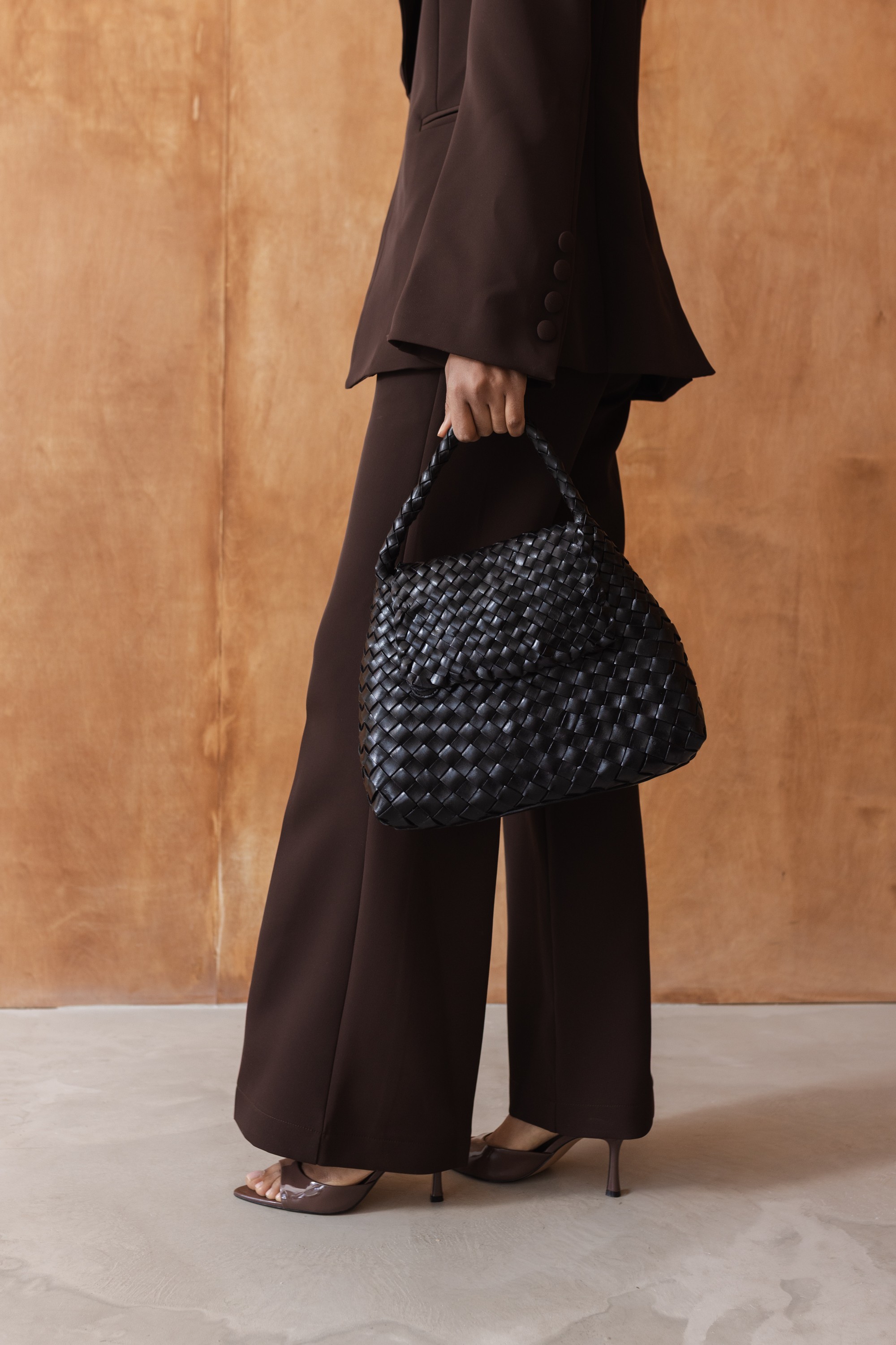 The woven structure adds depth and a luxurious look, while the short, comfortable handle allows the bag to be carried in the hand or on the forearm. This is the perfect choice for women who value timeless design with a fashionable twist.