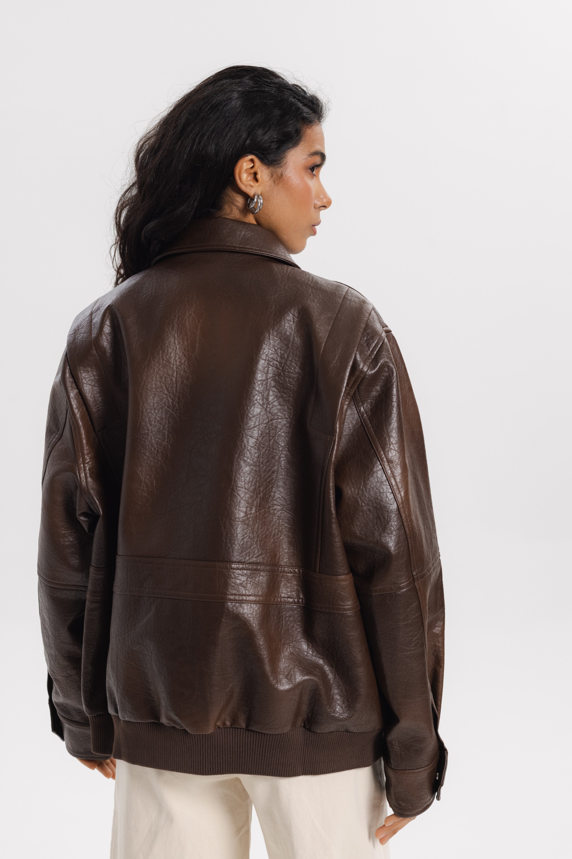 A stylish jacket with a timeless, slightly oversized cut, crafted from high-quality faux leather with a natural, slightly distressed finish. Its classic shape with a modern twist makes it a perfect addition to everyday outfits – from casual to more elegant.