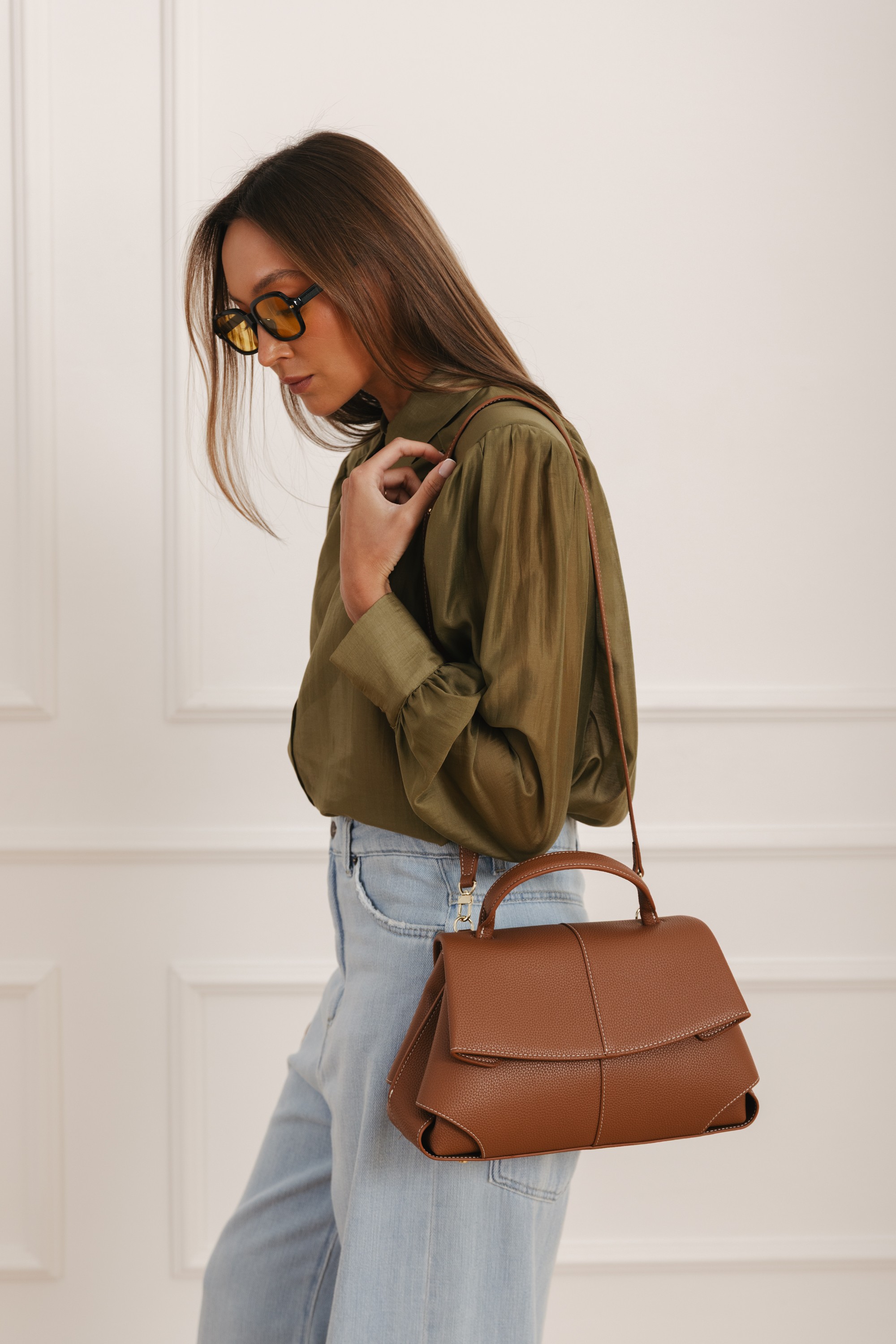 • Skórzana Torebka Z Klapą i Rączką Camel