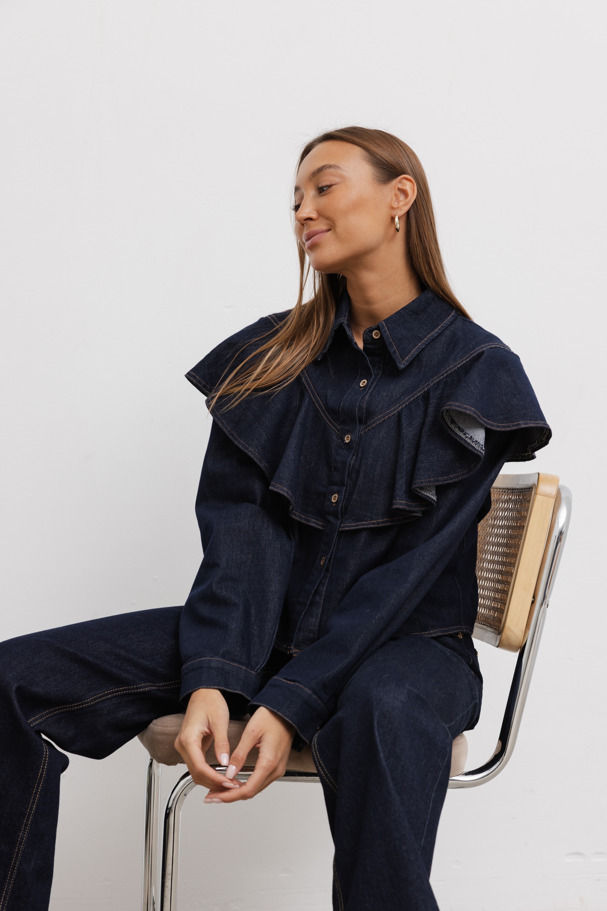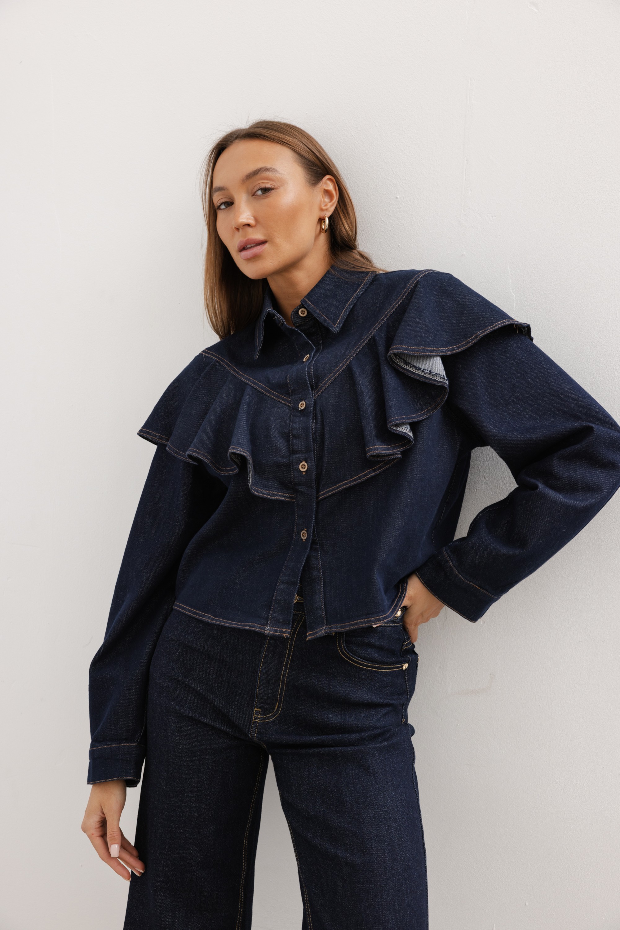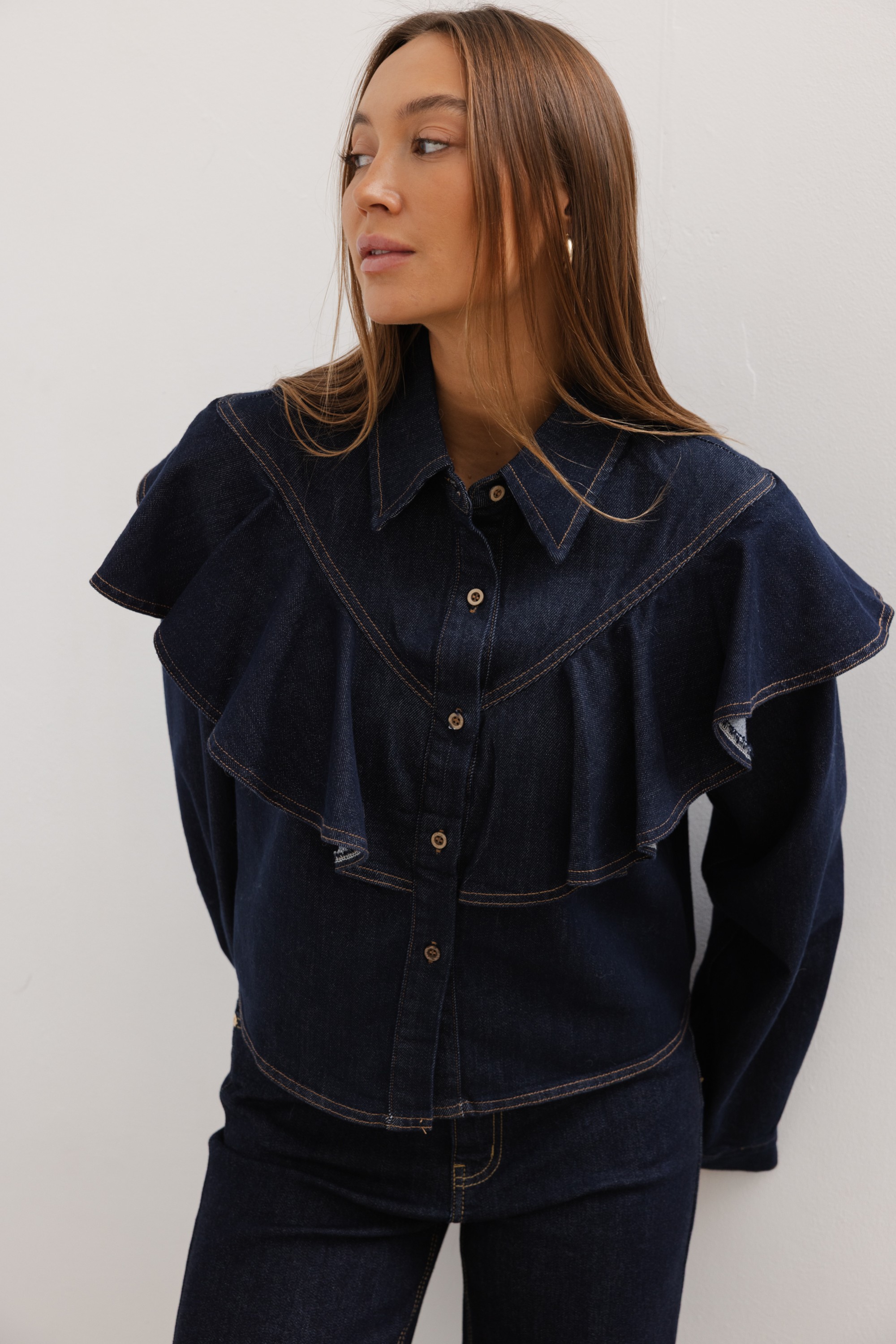 Stylowa koszula jeansowa z charakterystyczną falbaną na piersi, która dodaje jej wyjątkowego charakteru.