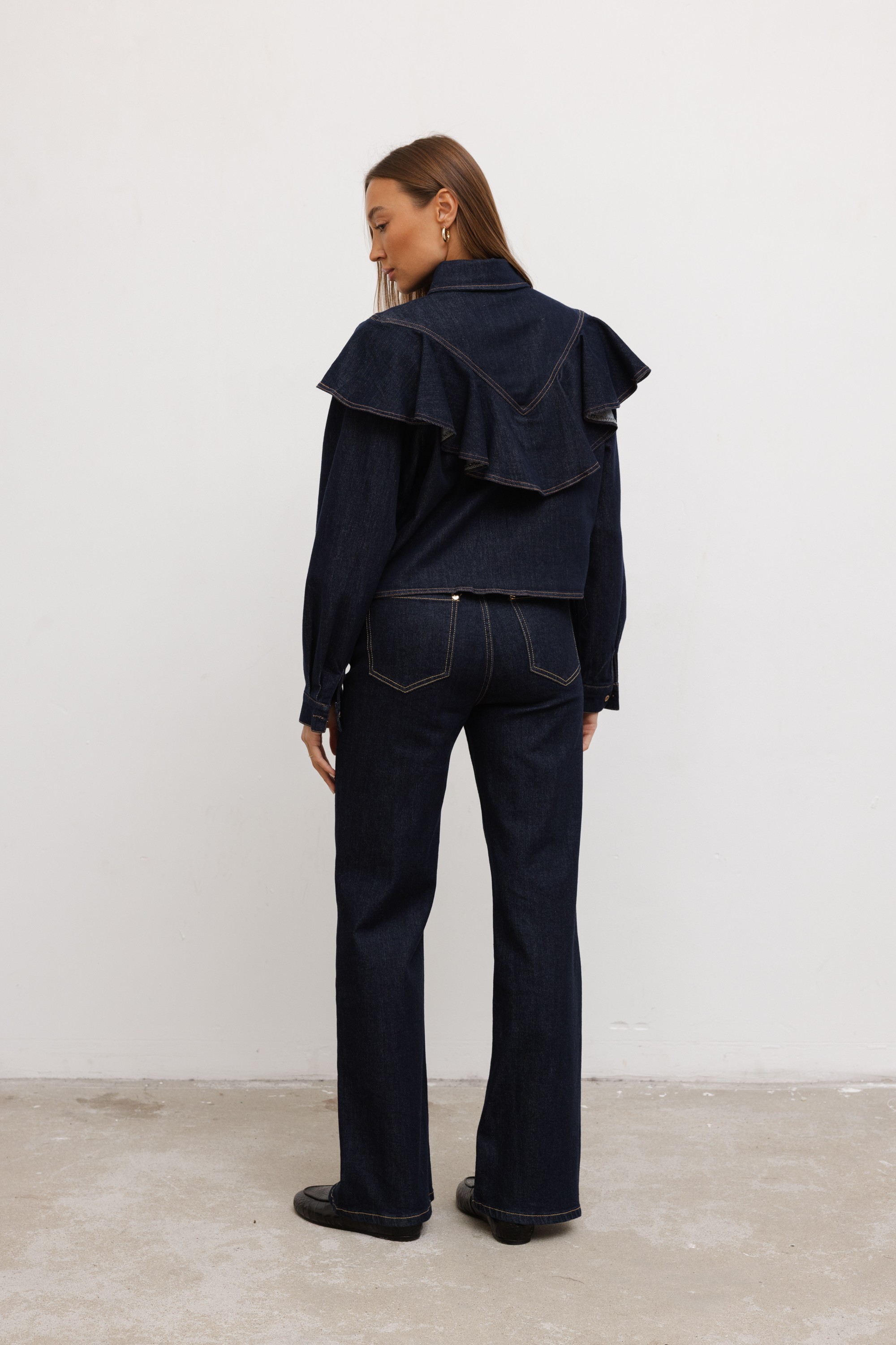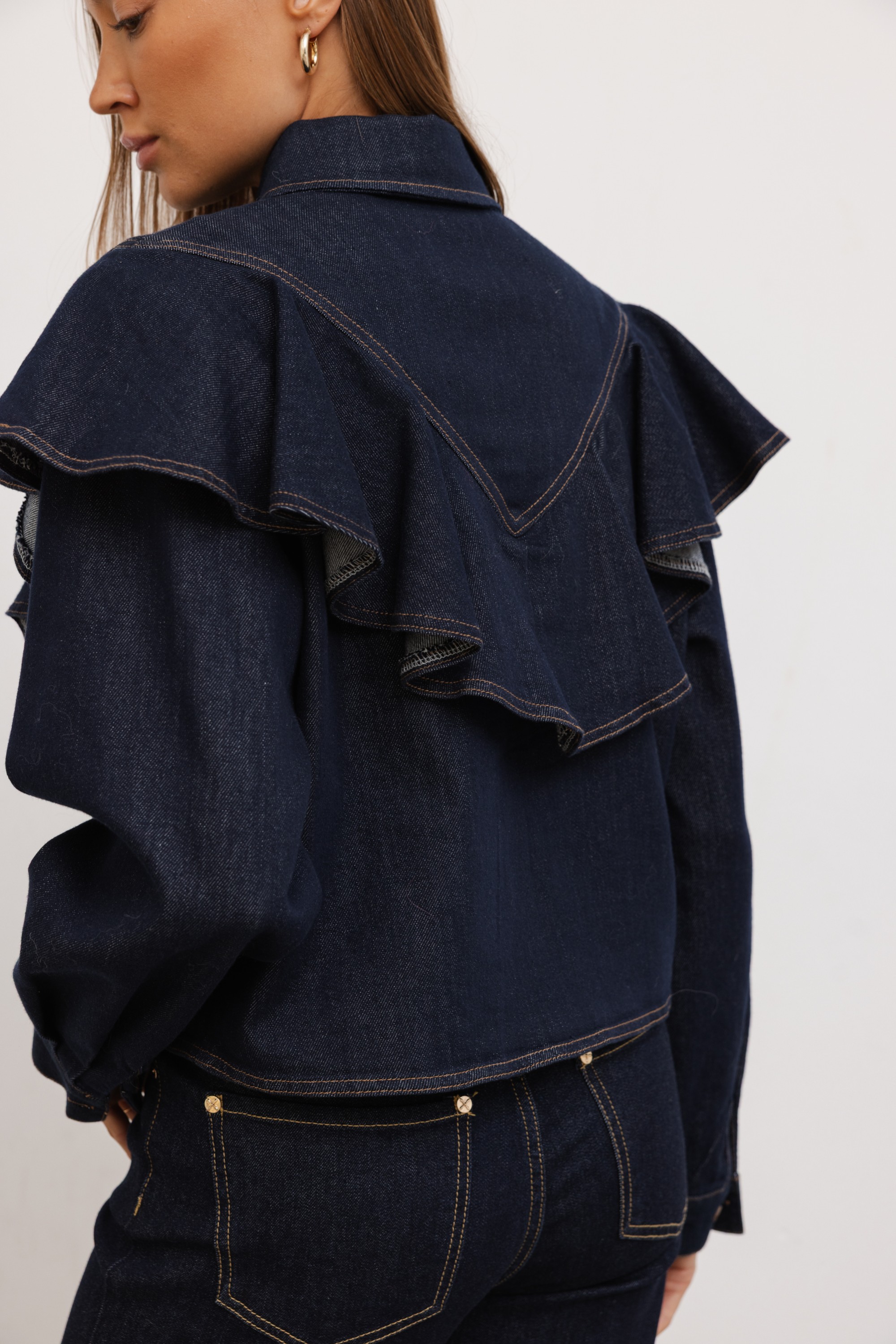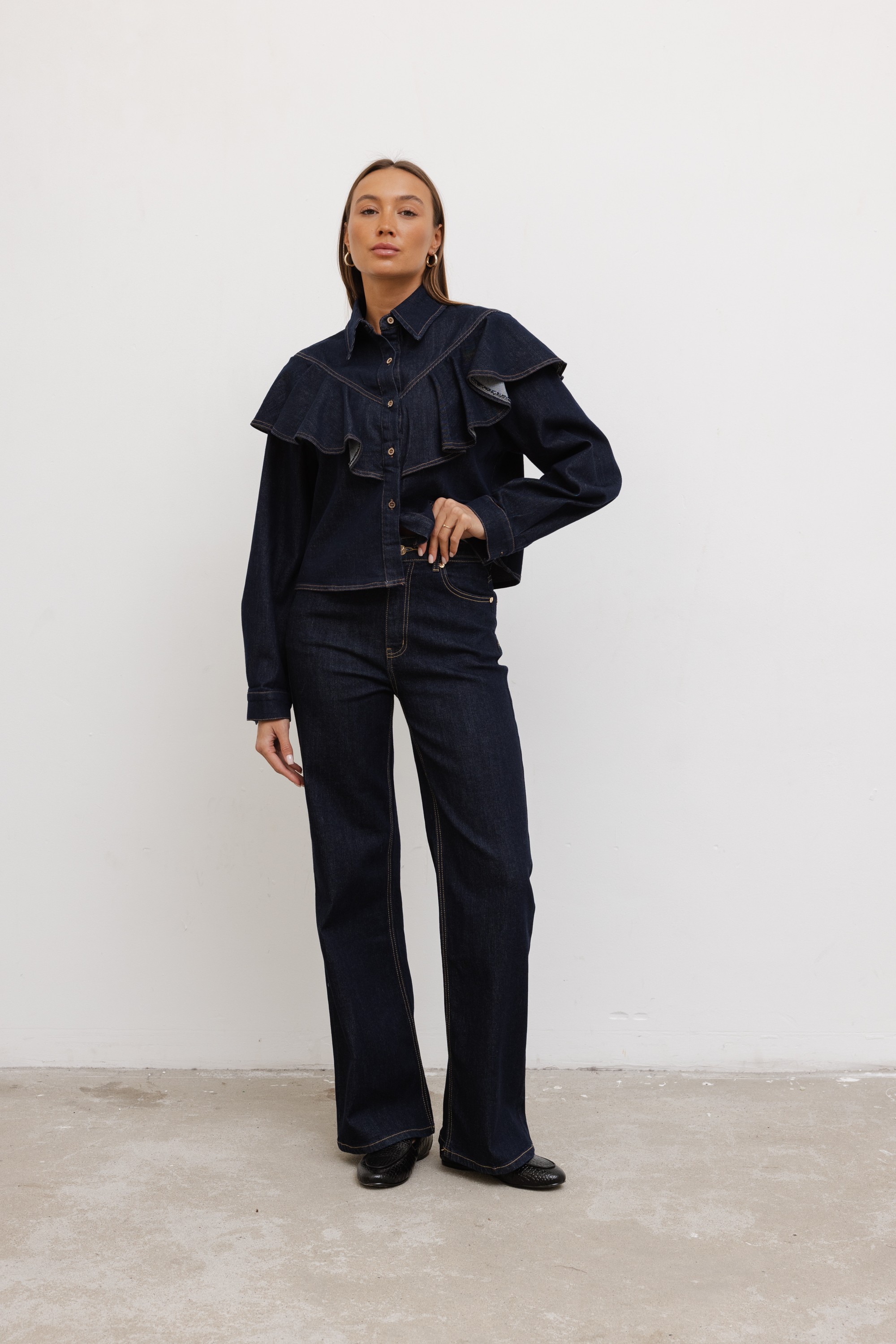 Stylowa koszula jeansowa z charakterystyczną falbaną na piersi, która dodaje jej wyjątkowego charakteru.