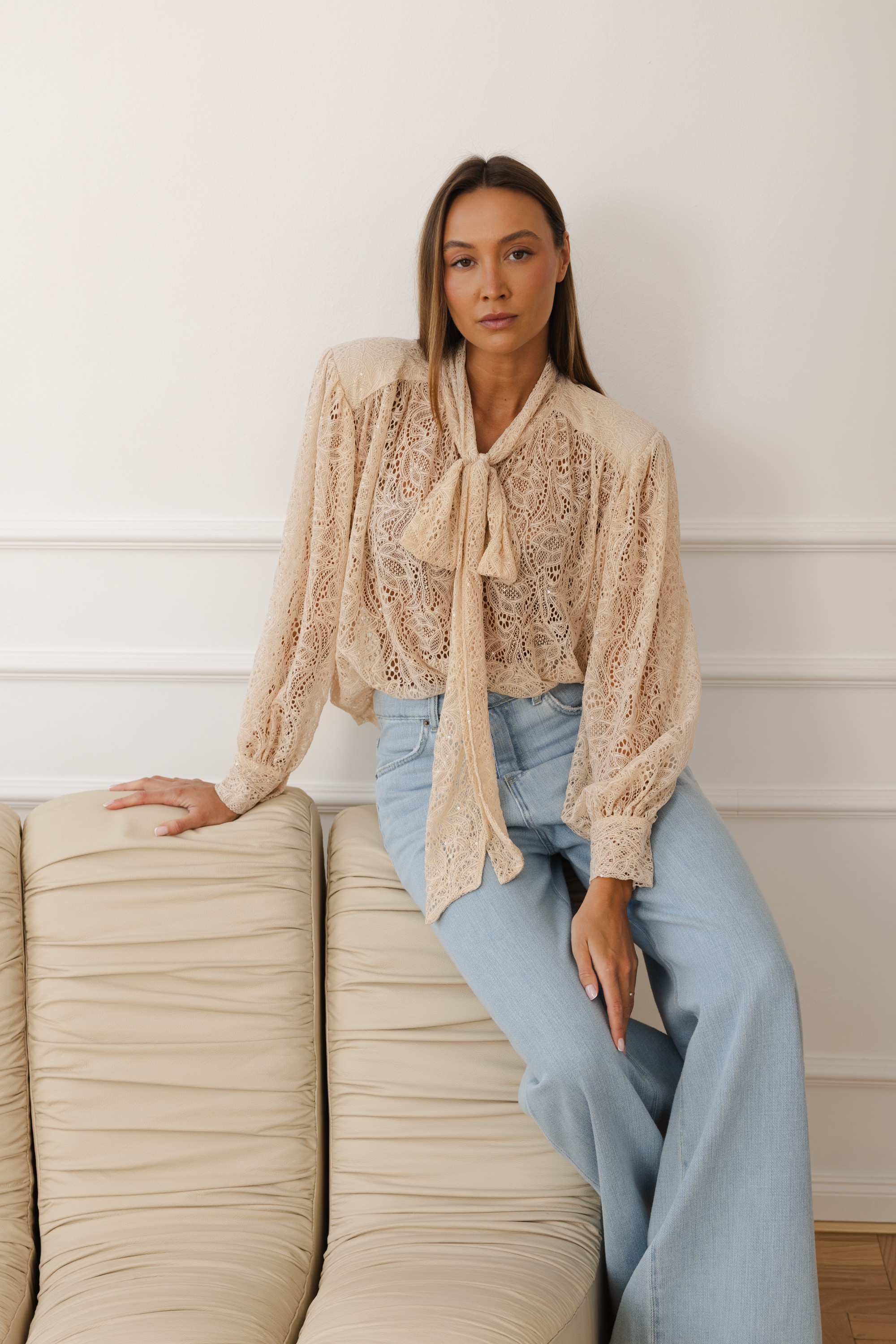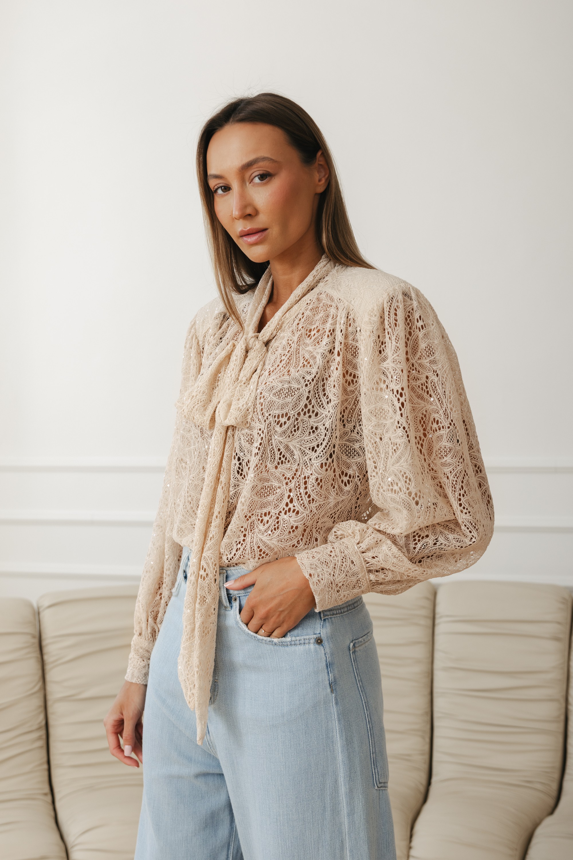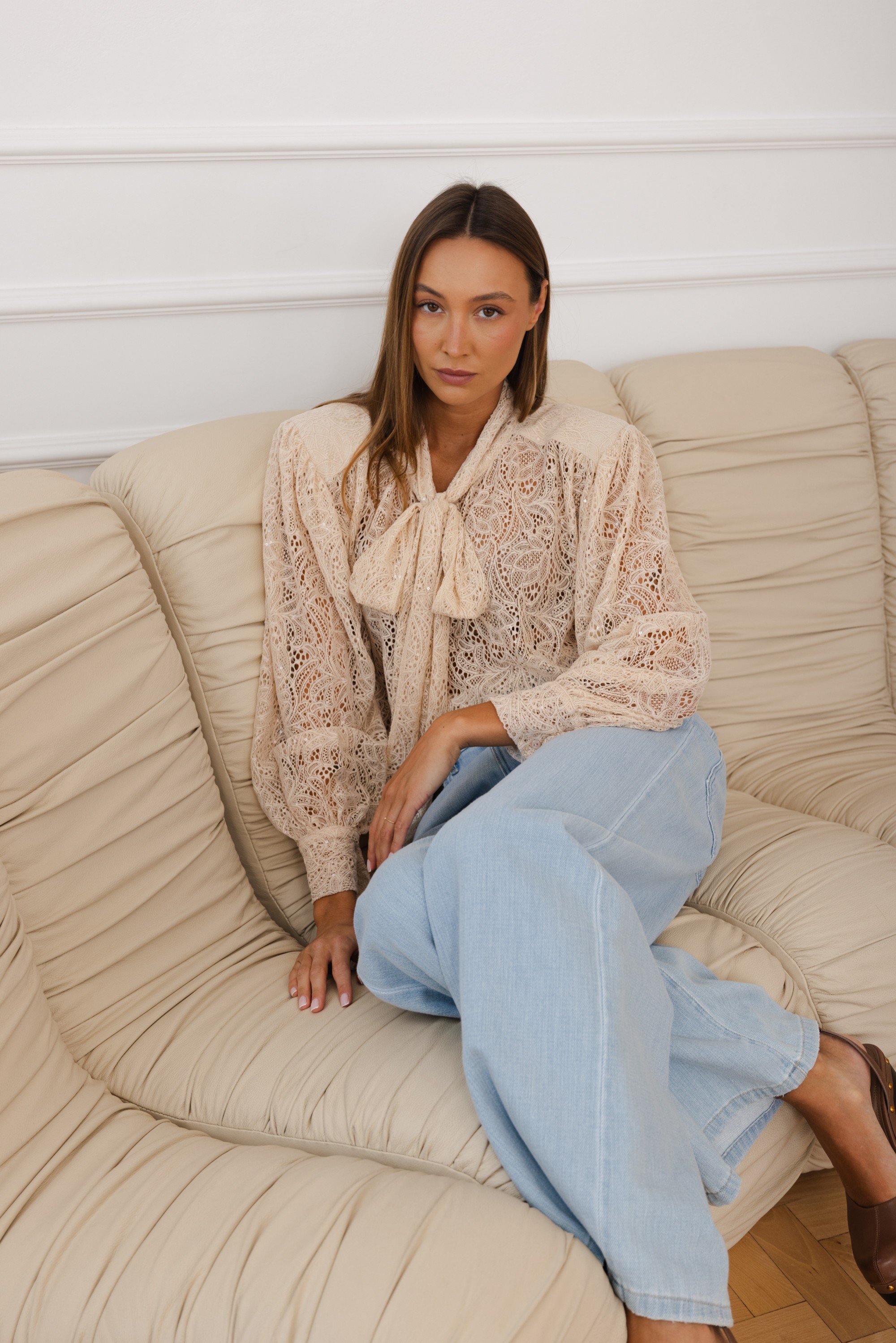 Model z wiązaniem pod szyją w formie subtelnej kokardy nadaje stylizacji lekkości i szyku. Bufiaste rękawy z delikatnym marszczeniem oraz dopracowane detale sprawiają, że bluzka prezentuje się wyjątkowo zarówno w codziennym zestawieniu z jeansami, jak i w bardziej eleganckiej stylizacji.