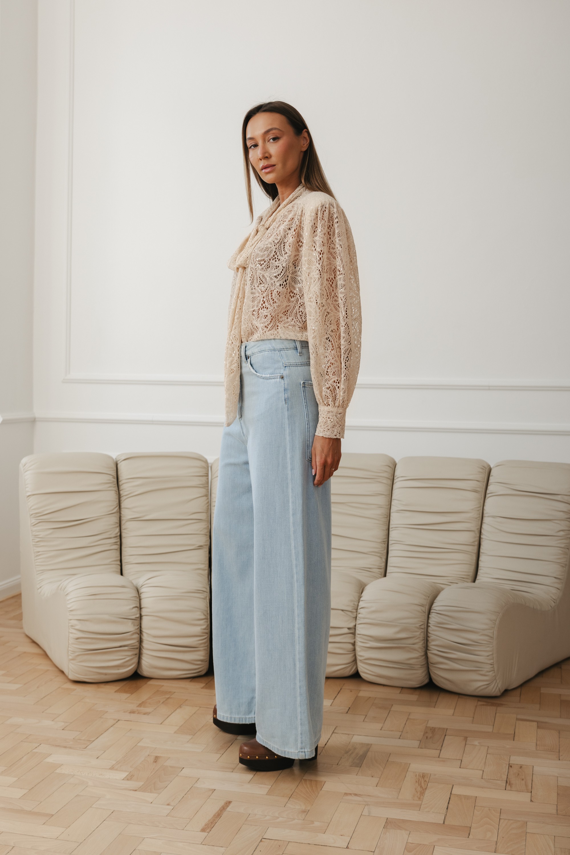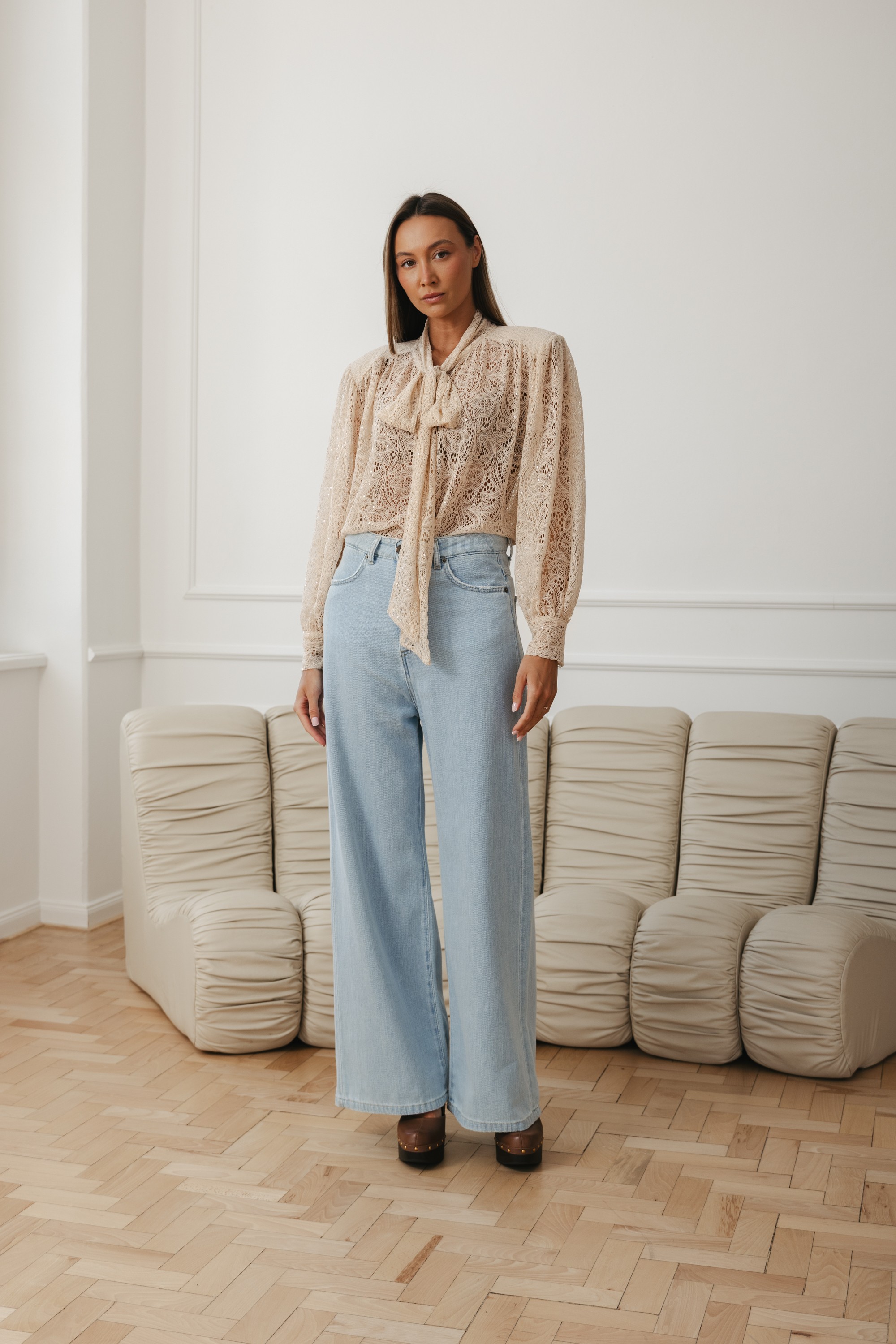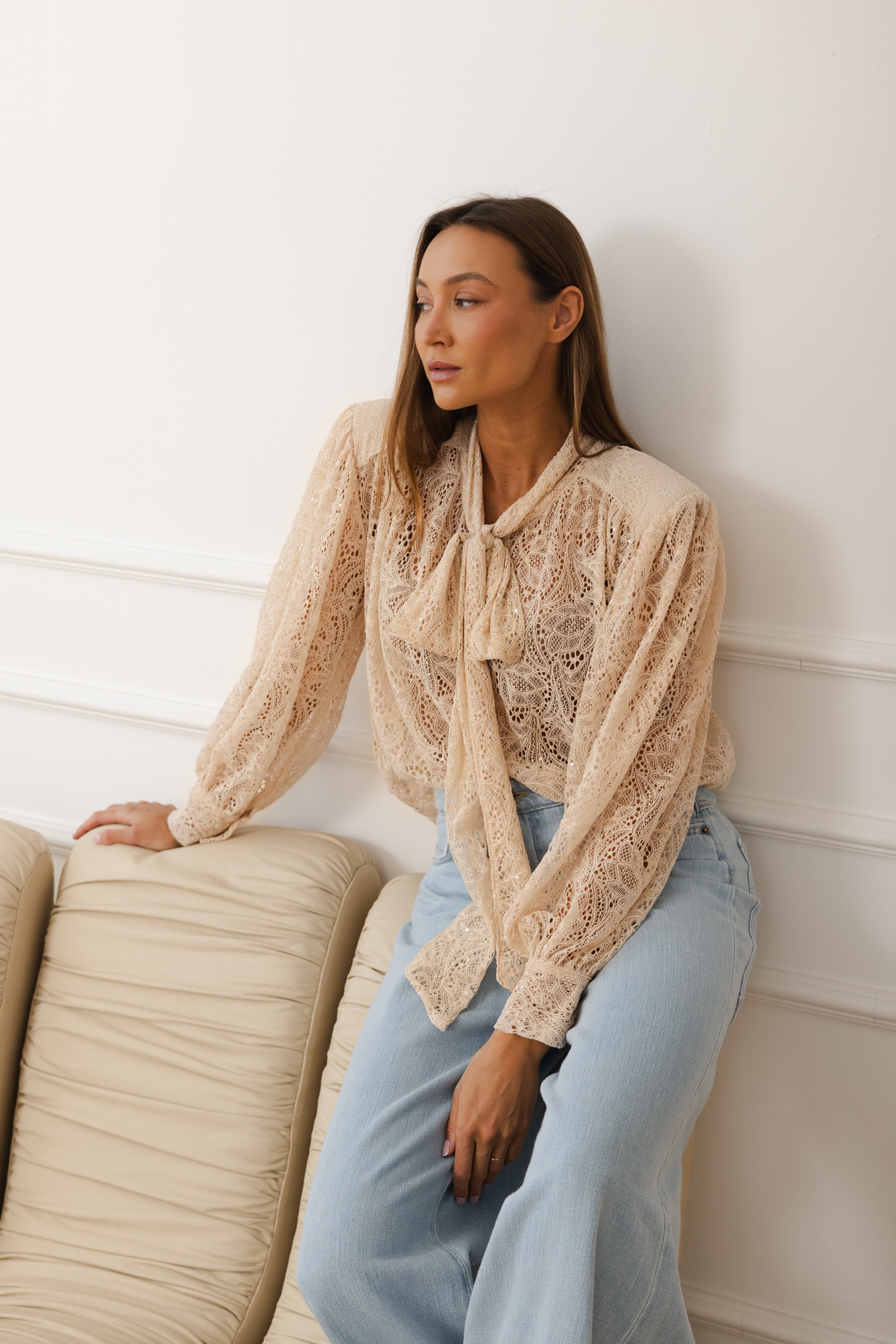 Model z wiązaniem pod szyją w formie subtelnej kokardy nadaje stylizacji lekkości i szyku. Bufiaste rękawy z delikatnym marszczeniem oraz dopracowane detale sprawiają, że bluzka prezentuje się wyjątkowo zarówno w codziennym zestawieniu z jeansami, jak i w bardziej eleganckiej stylizacji.