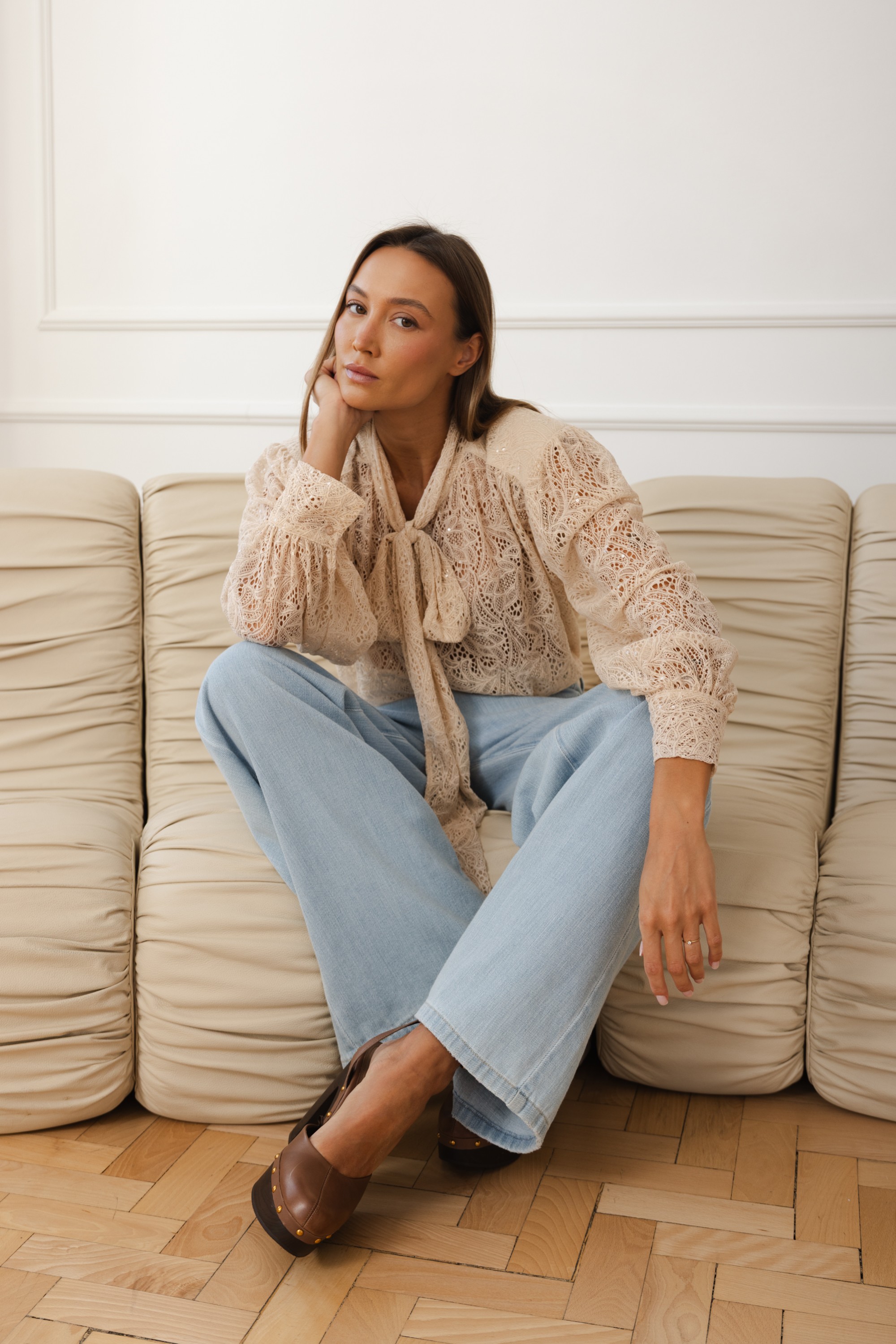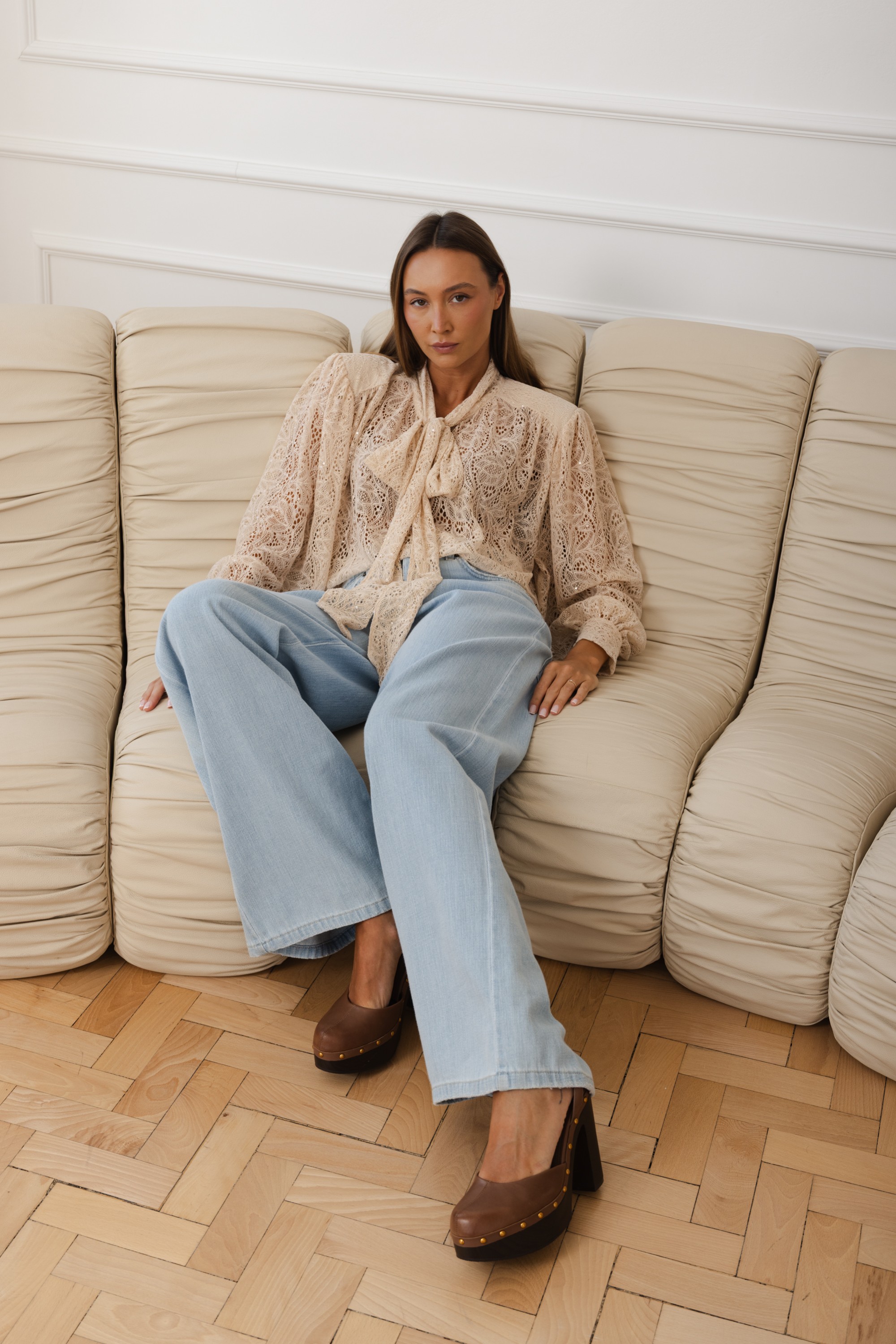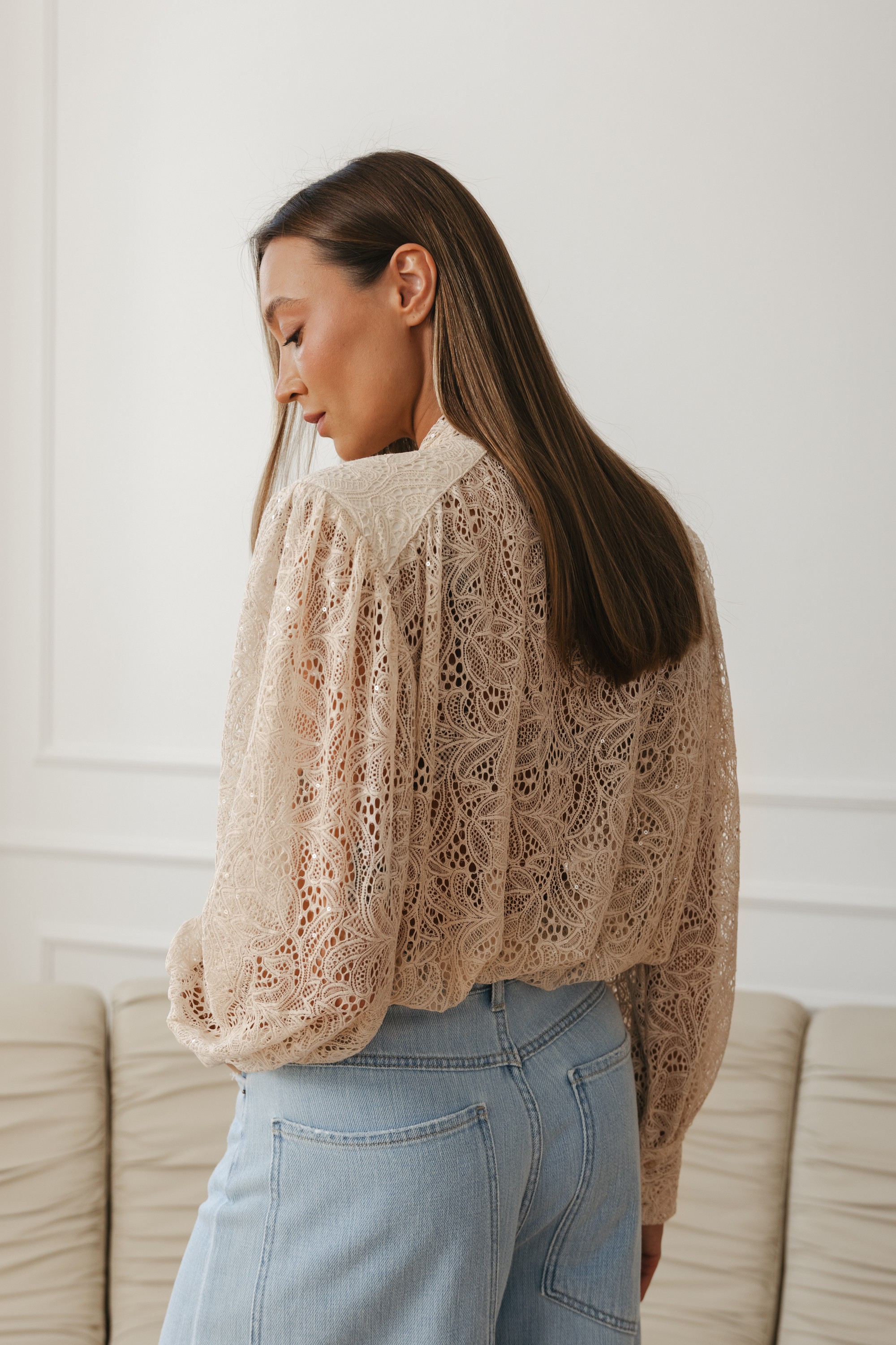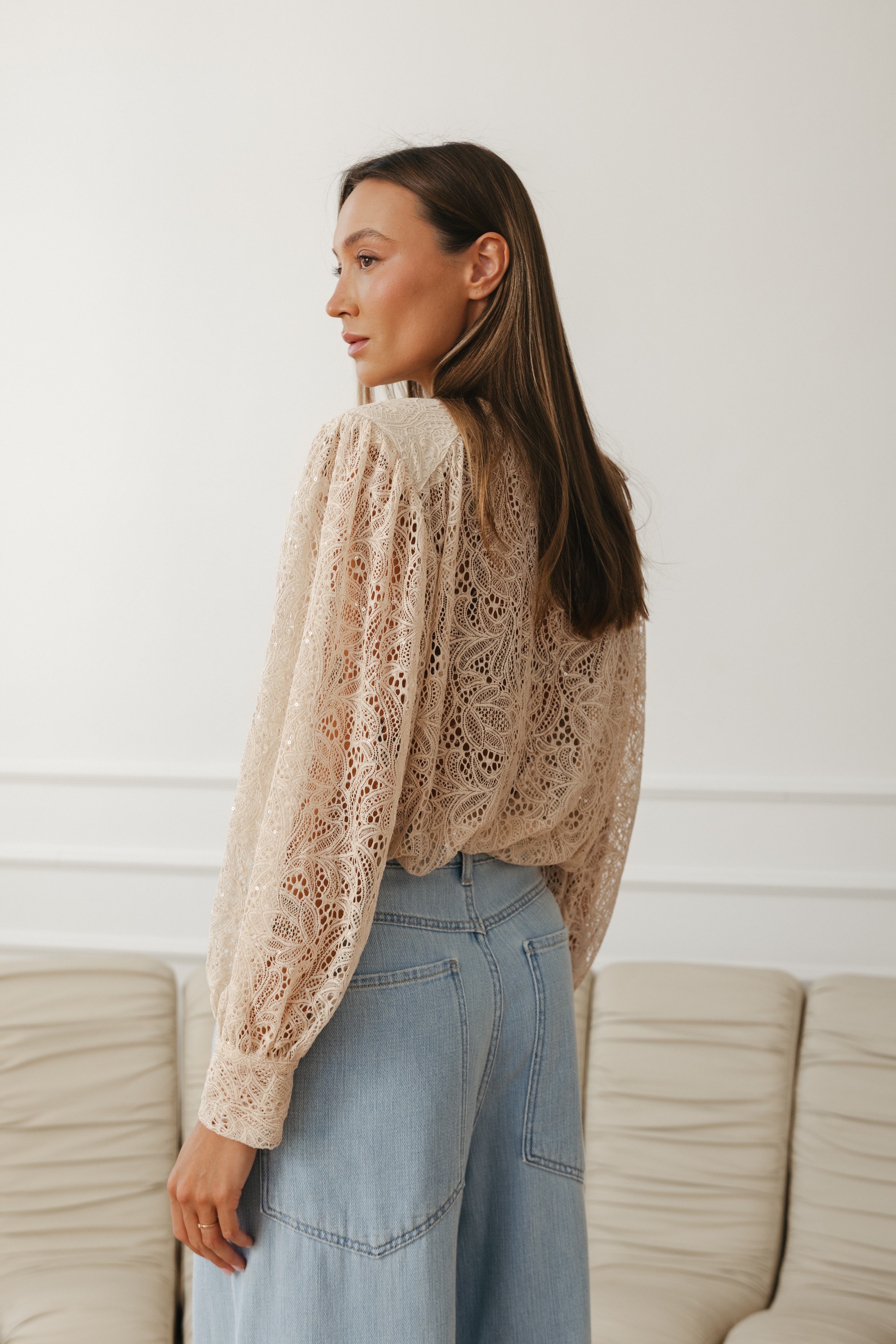 Elegancka i niezwykle kobieca propozycja w romantycznym wydaniu. Wykonana z delikatnej, ażurowej koronki w ciepłym, beżowym odcieniu, który pięknie podkreśla cerę i wpisuje się w naturalną, wiosenną paletę kolorów.