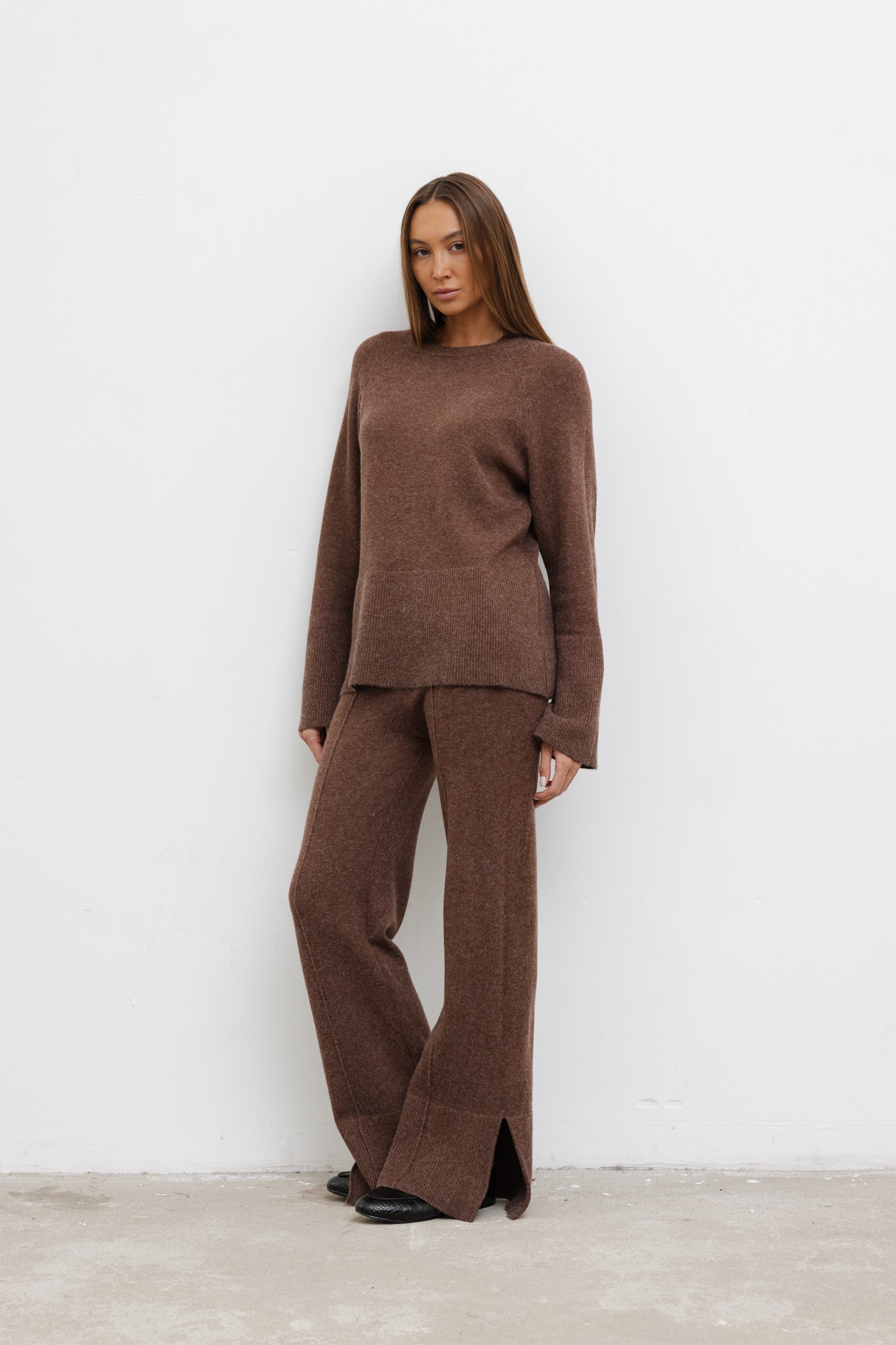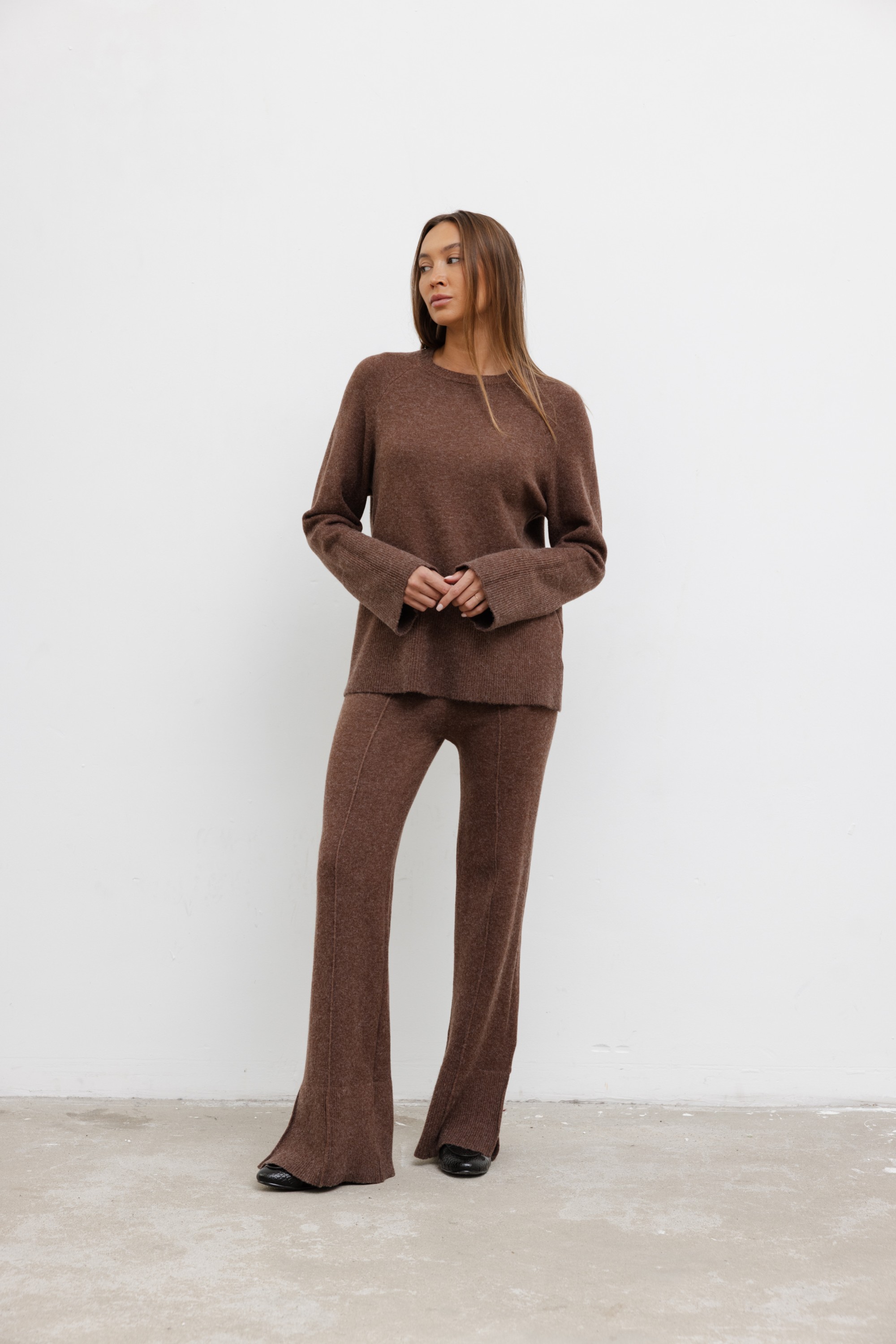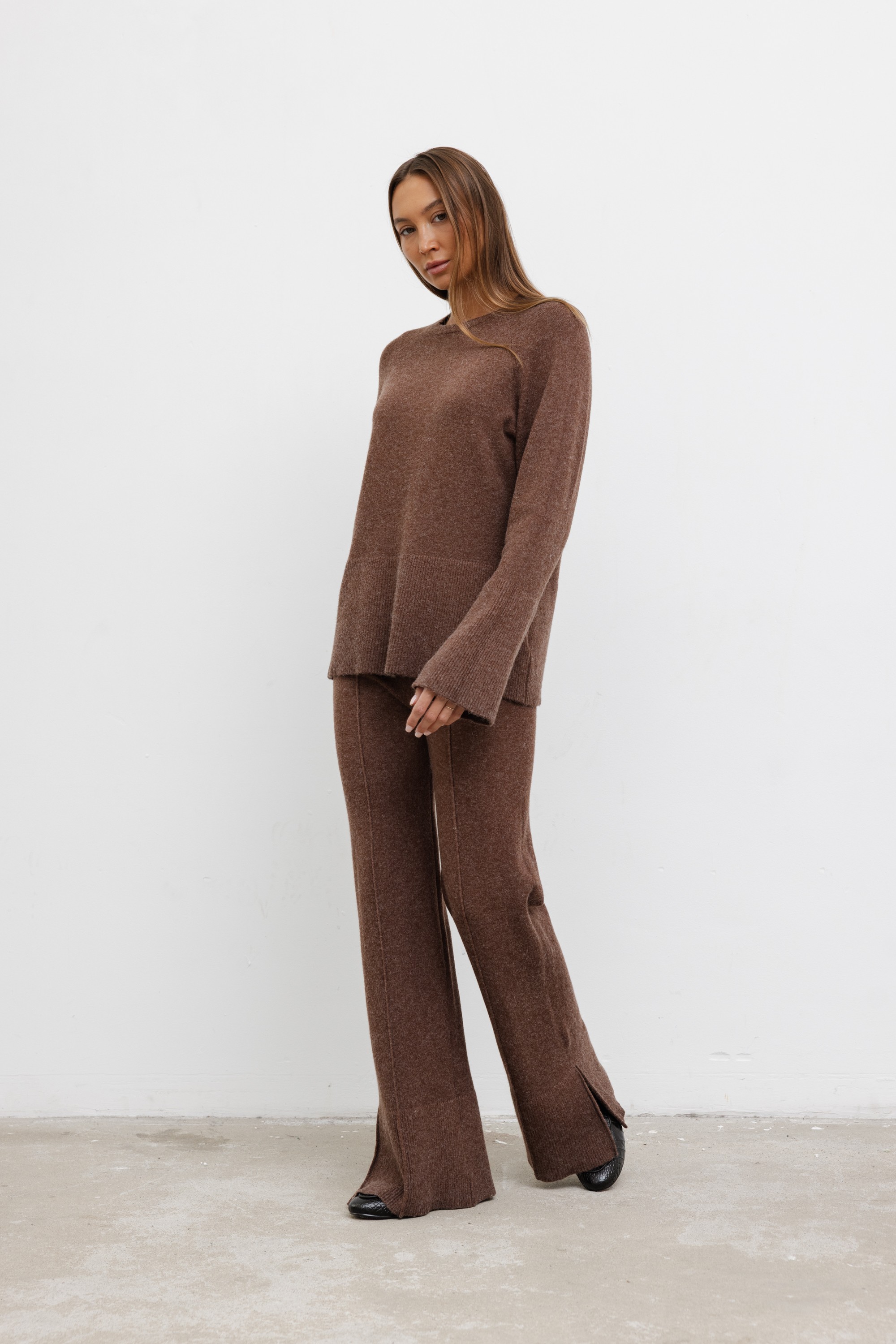Dzianinowy komplet, który łączy wygodę i nowoczesny styl. Składa się z luźnego swetra z długim rękawem oraz spodni o prostym kroju z rozcięciami u dołu nogawek. Miękka, elastyczna dzianina zapewnia komfort noszenia i swobodę ruchów, idealna na co dzień i na luźniejsze wyjścia.