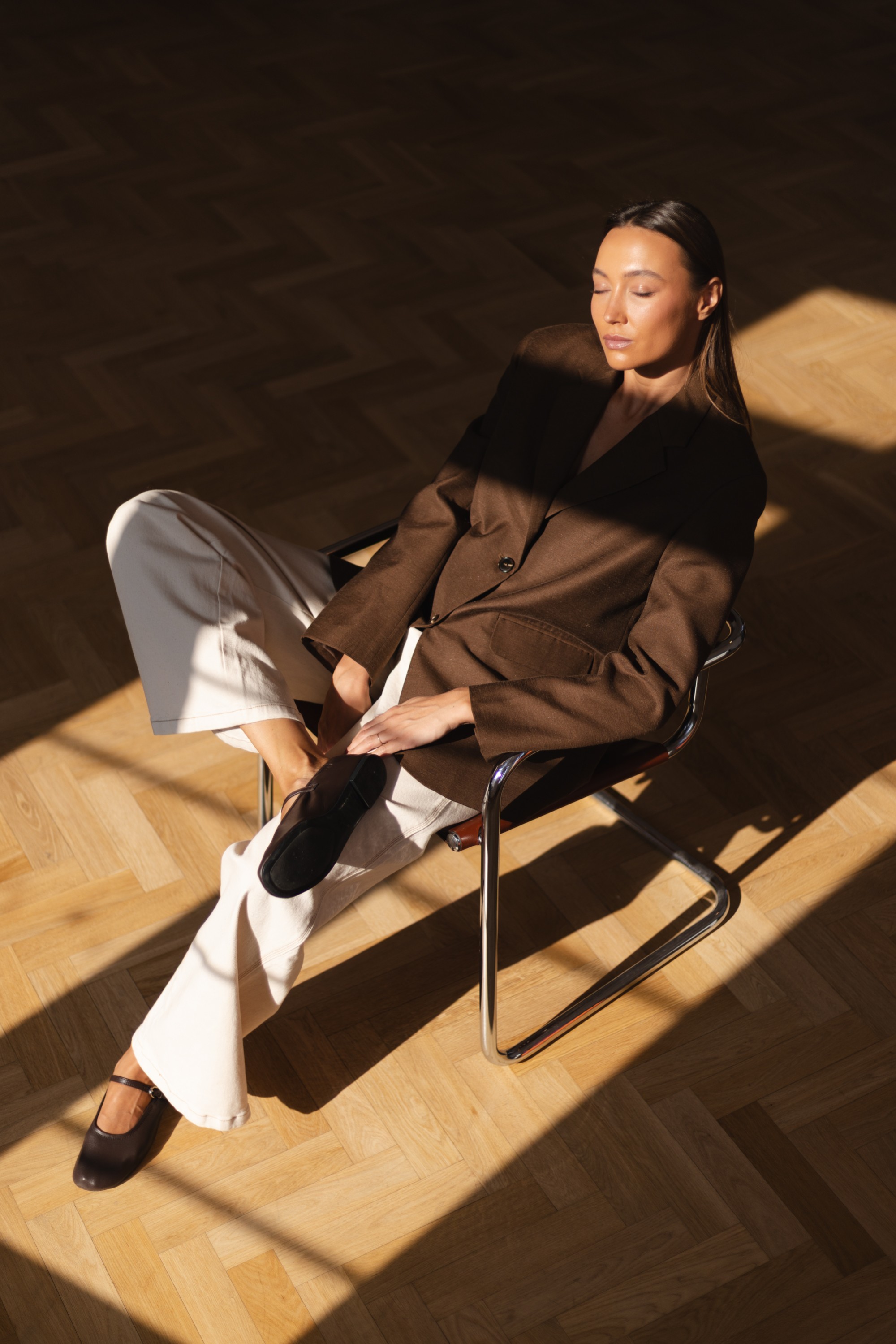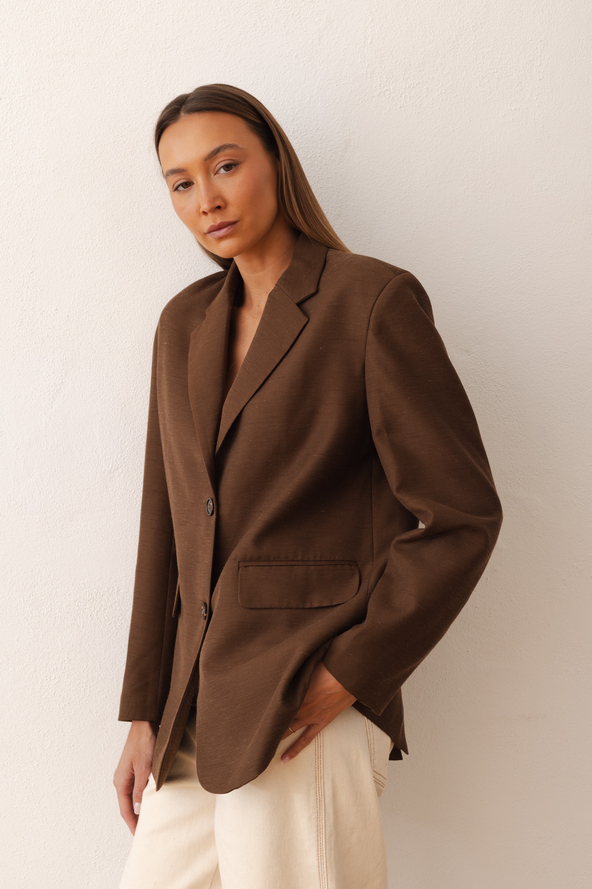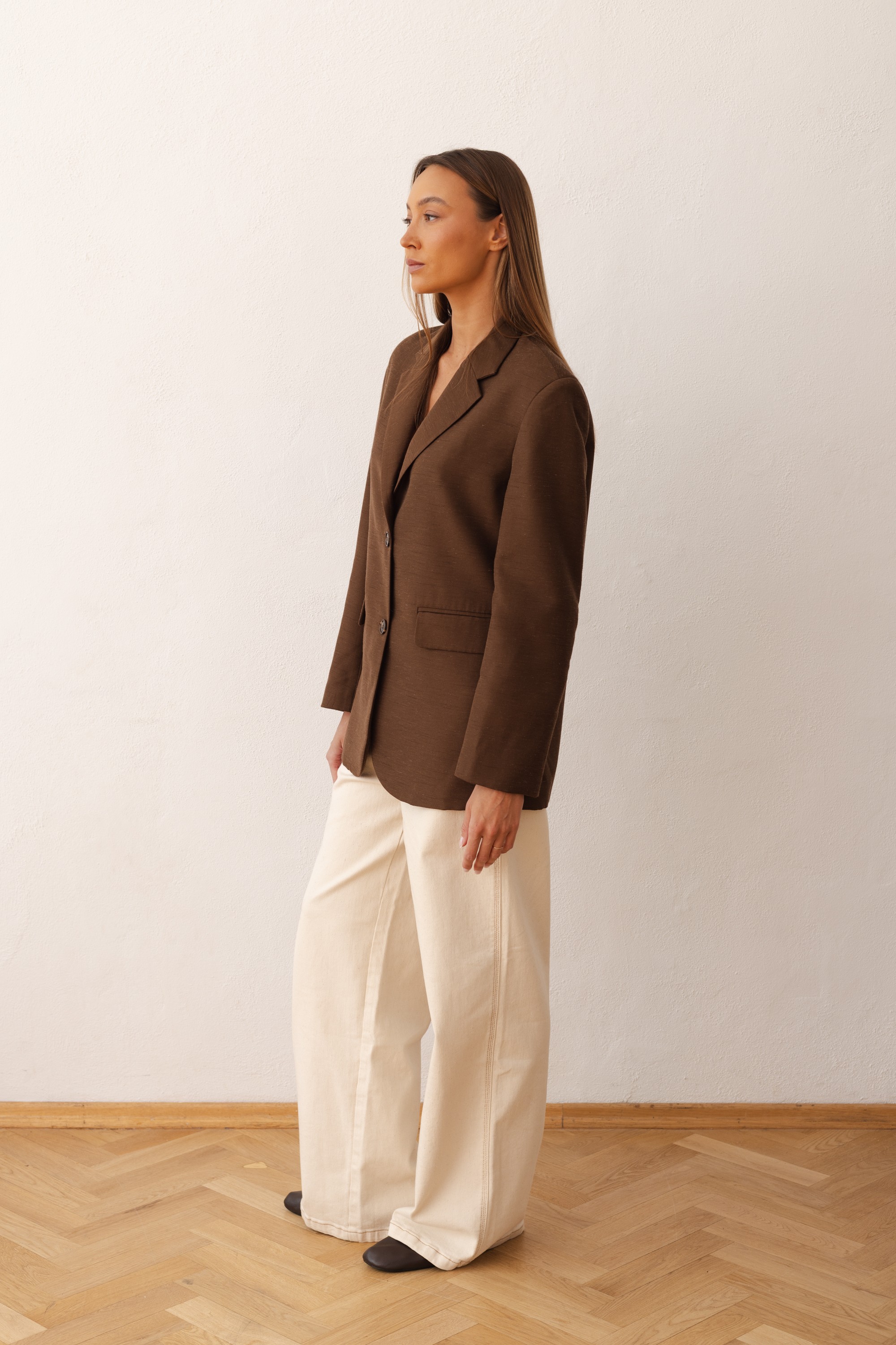 Klasyczna marynarka w nowoczesnym wydaniu, wykonana z wysokiej jakości tkaniny o subtelnej strukturze. Prosty, lekko oversize’owy fason nadaje sylwetce swobodnego charakteru, jednocześnie zachowując elegancki i dopracowany wygląd.