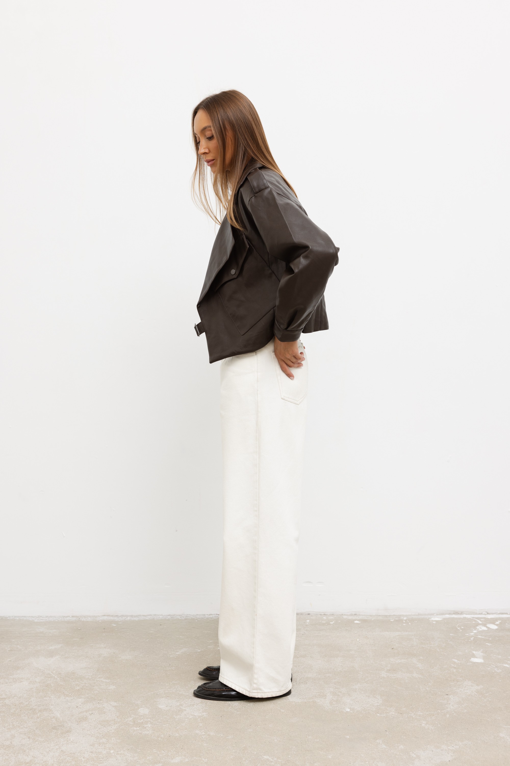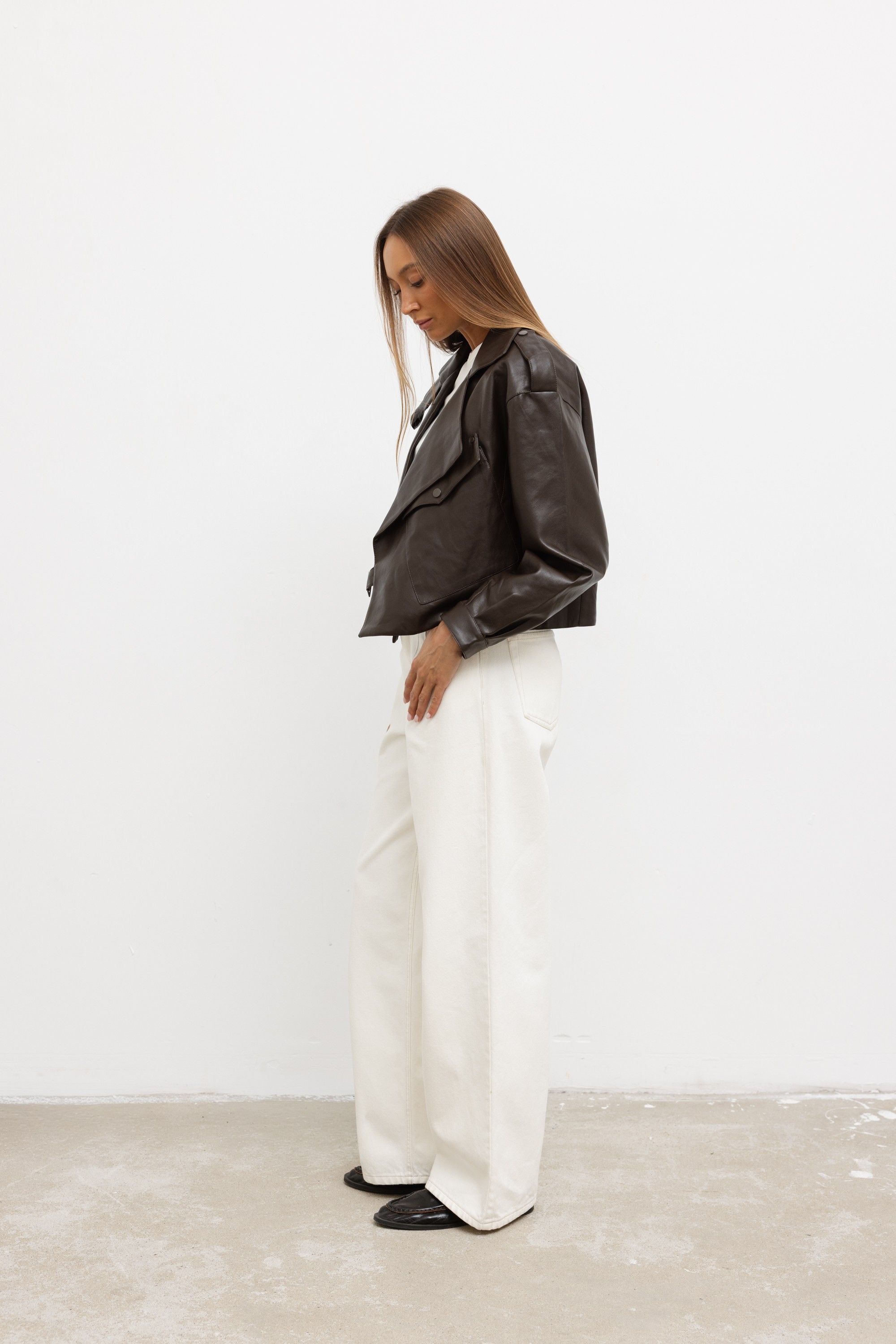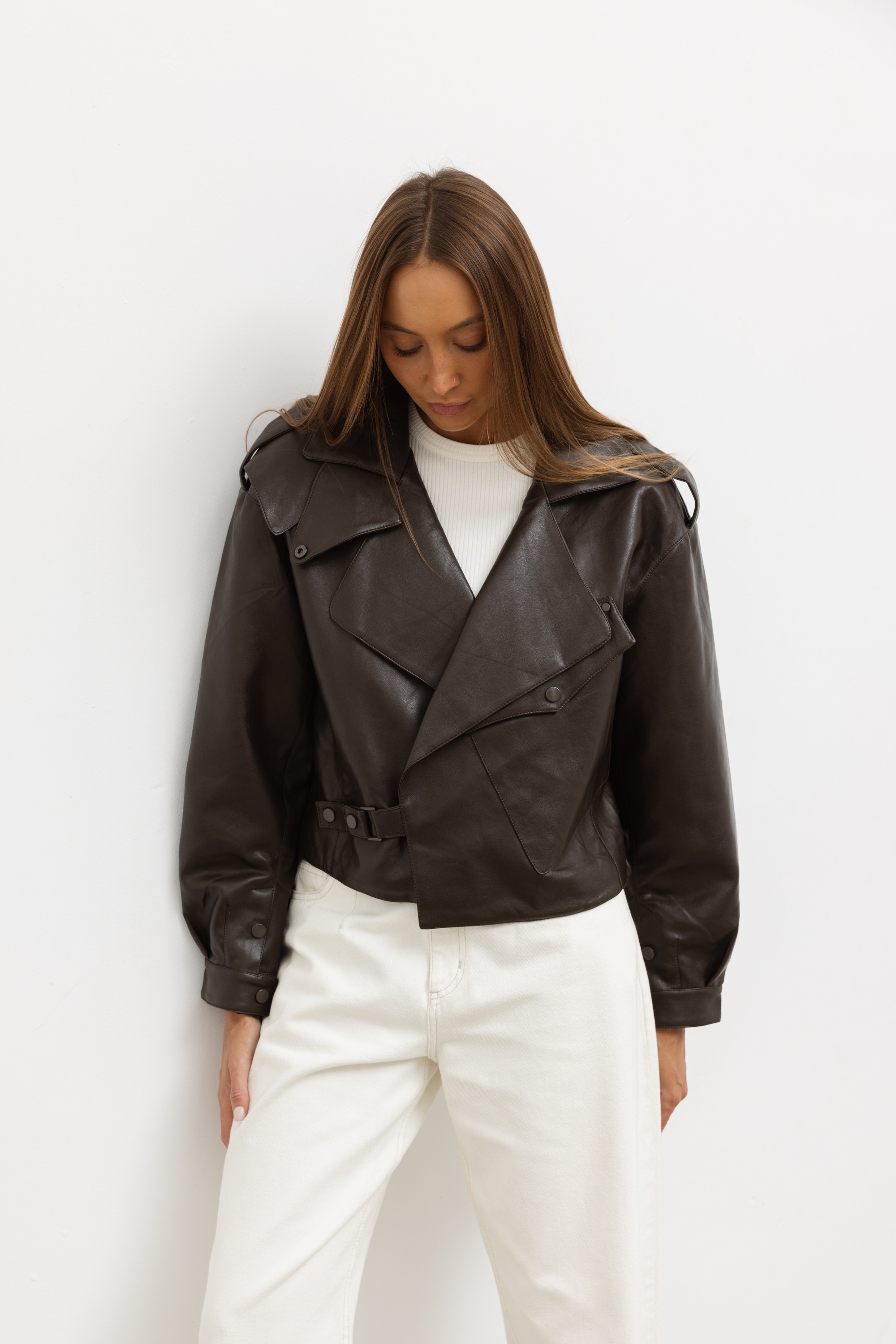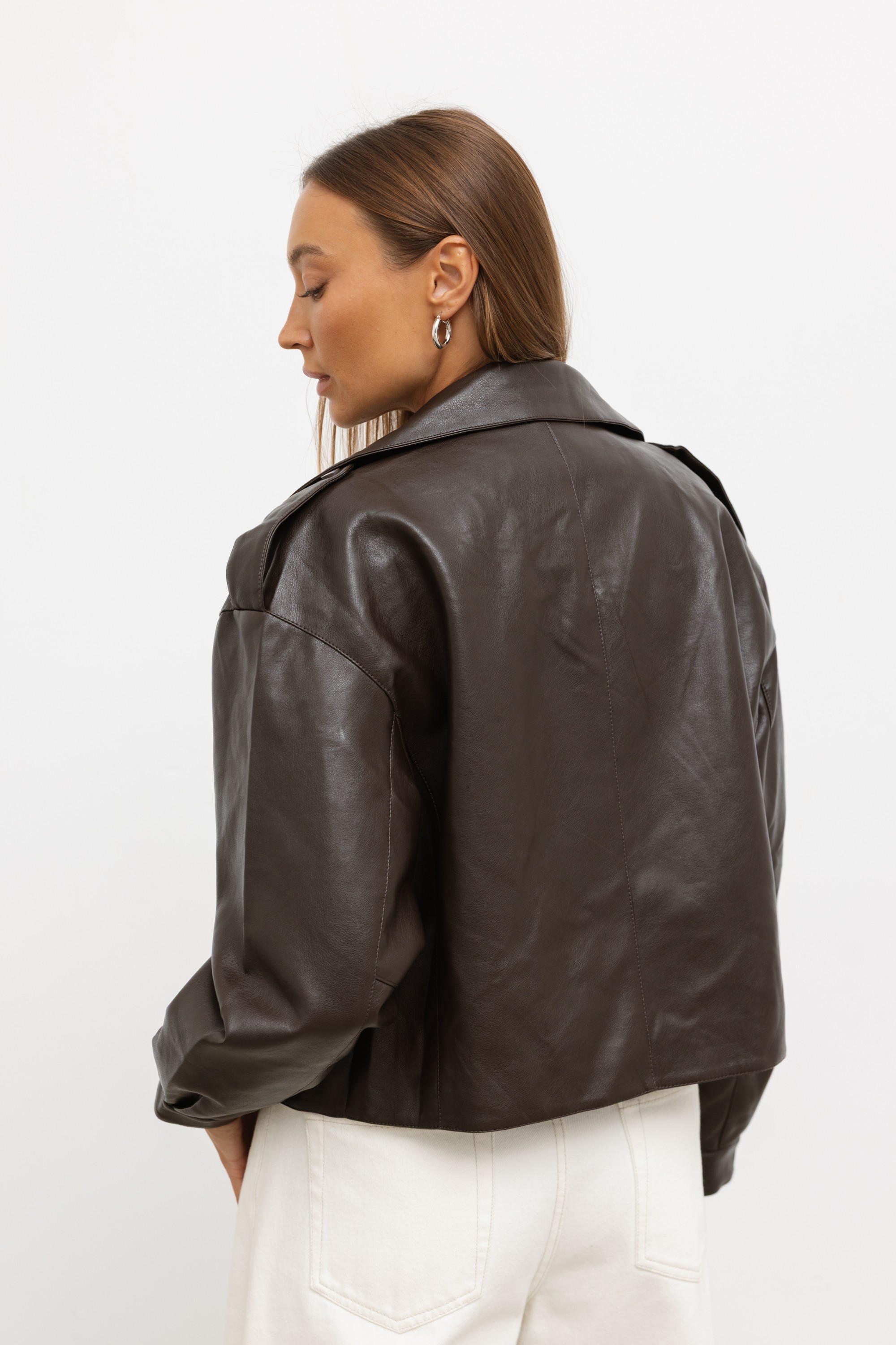 Ramoneska o krótszym, pudełkowym kroju. Linia ramion obniżona, zapinana na zatrzaski. Wykonana z eko skóry. Duży efektowny kołnierz, rękawy zakończone mankietem z zatrzaskami. Kurtka typu biker w nieco bardziej eleganckim wydaniu.