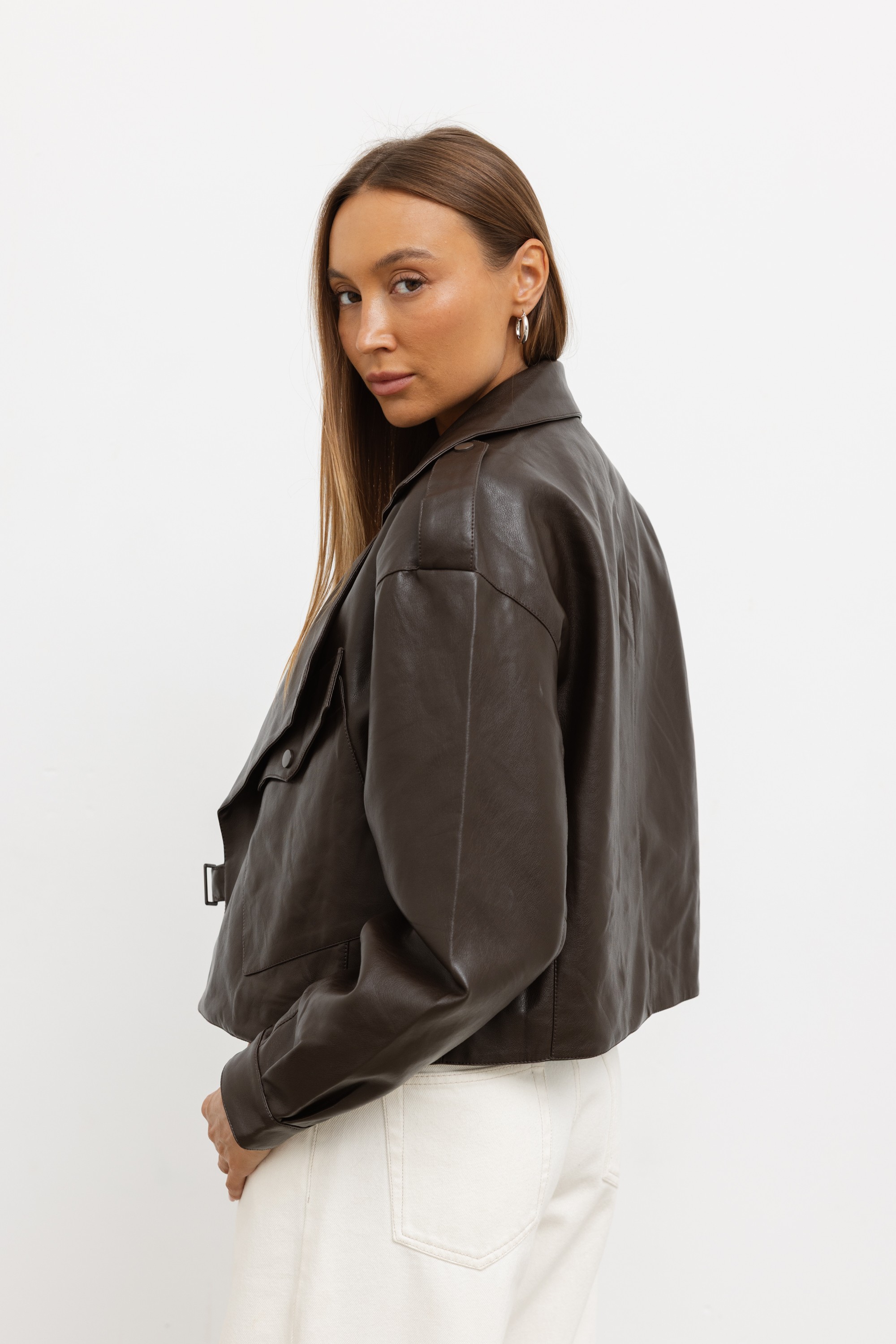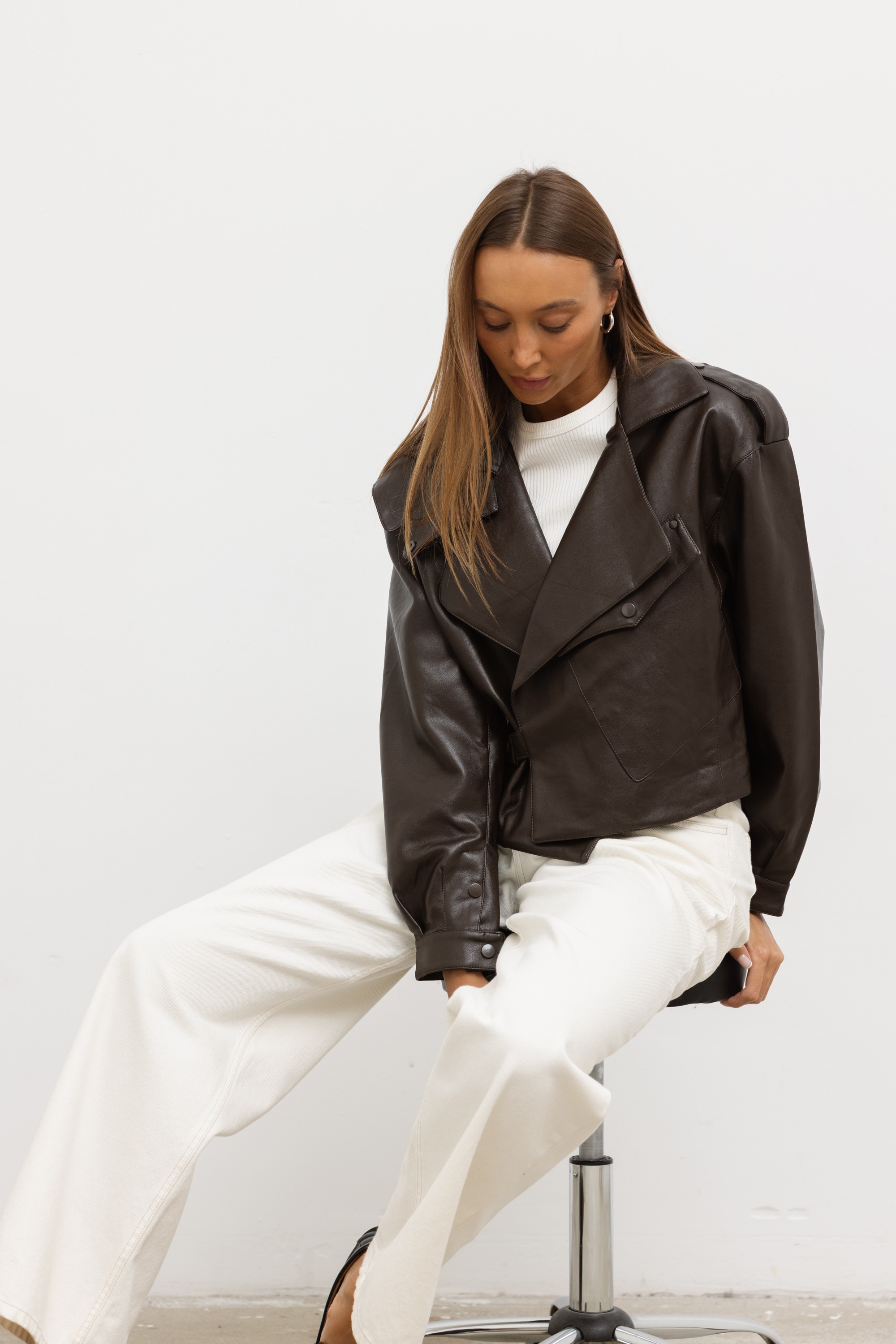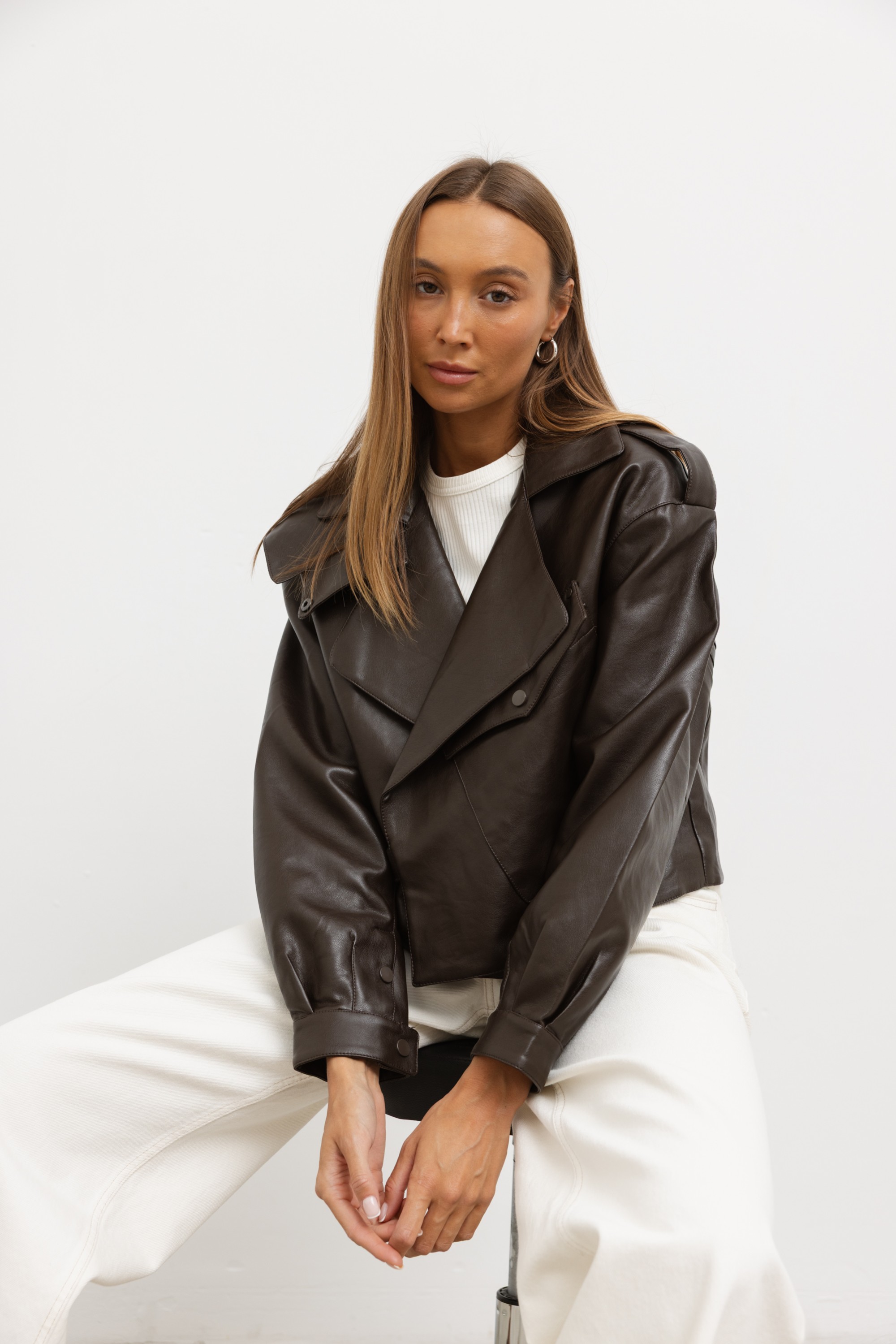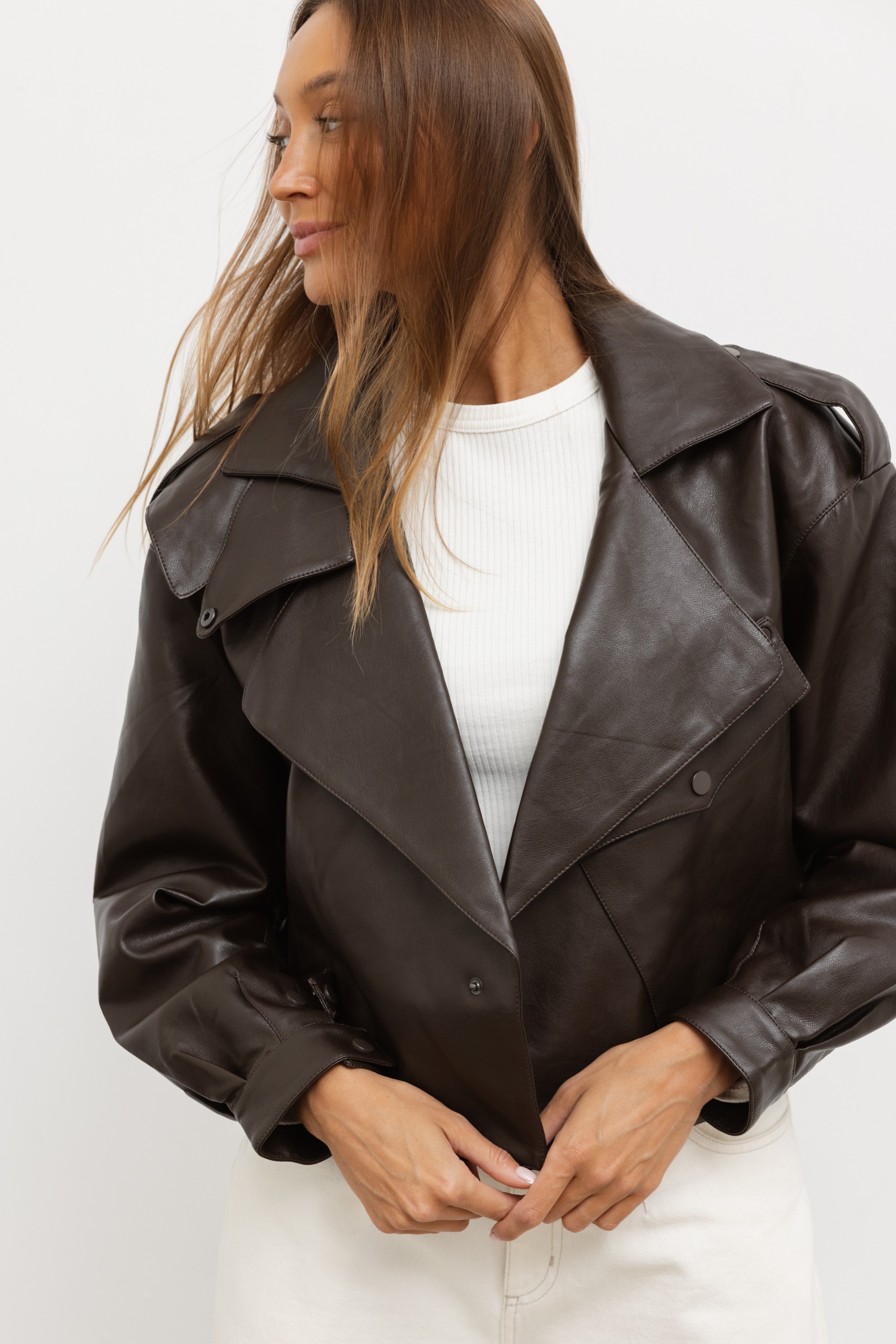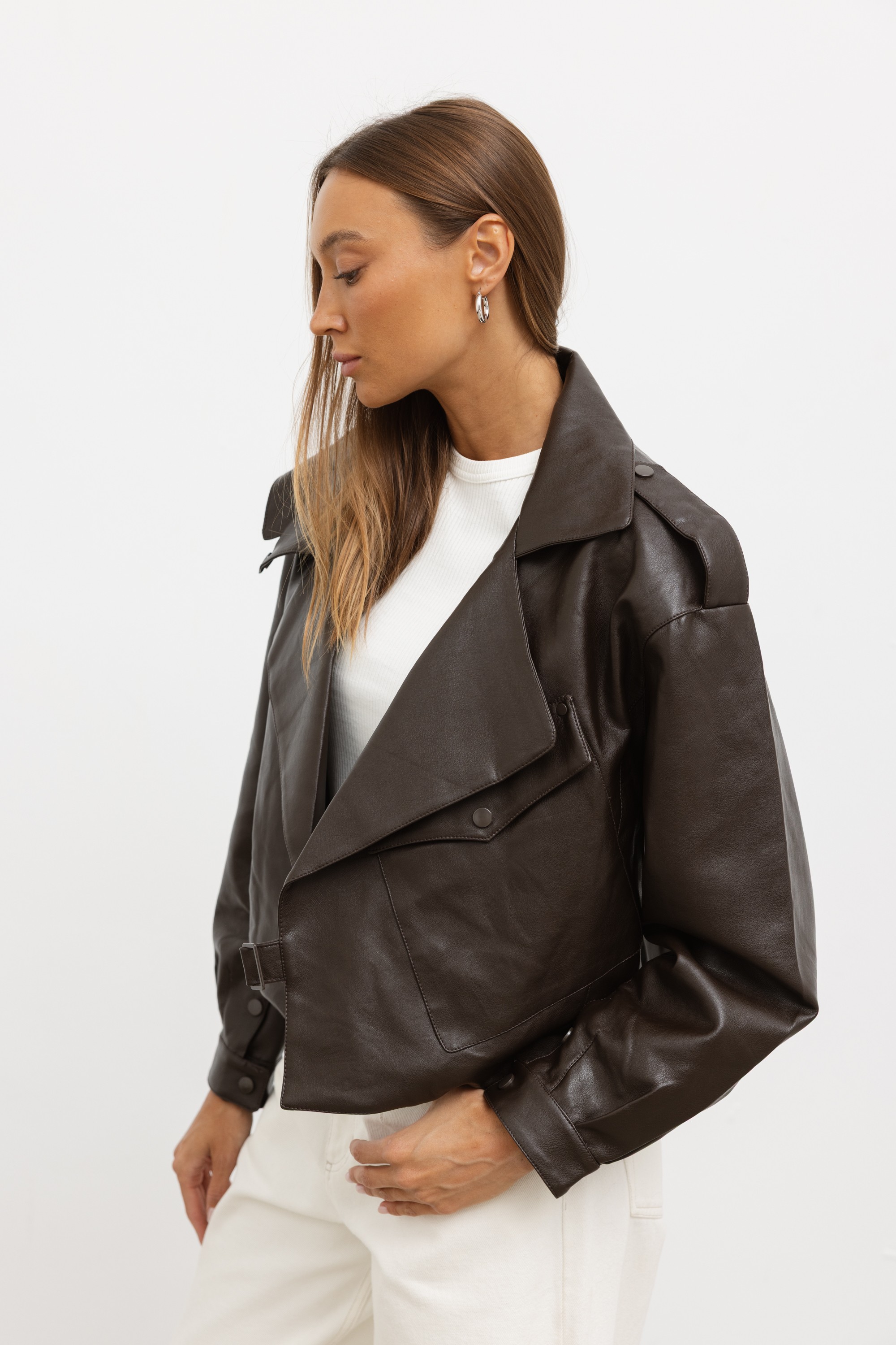 Ramoneska o krótszym, pudełkowym kroju. Linia ramion obniżona, zapinana na zatrzaski. Wykonana z eko skóry. Duży efektowny kołnierz, rękawy zakończone mankietem z zatrzaskami. Kurtka typu biker w nieco bardziej eleganckim wydaniu.