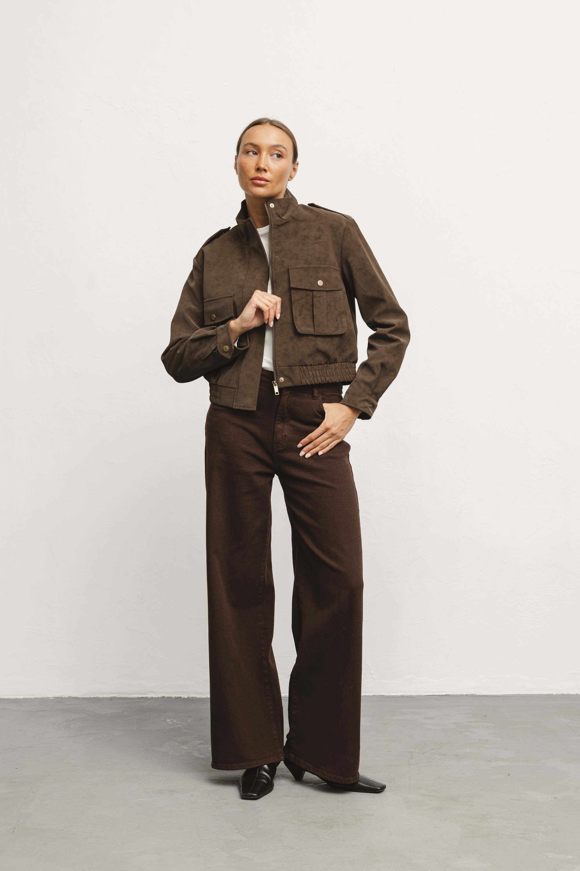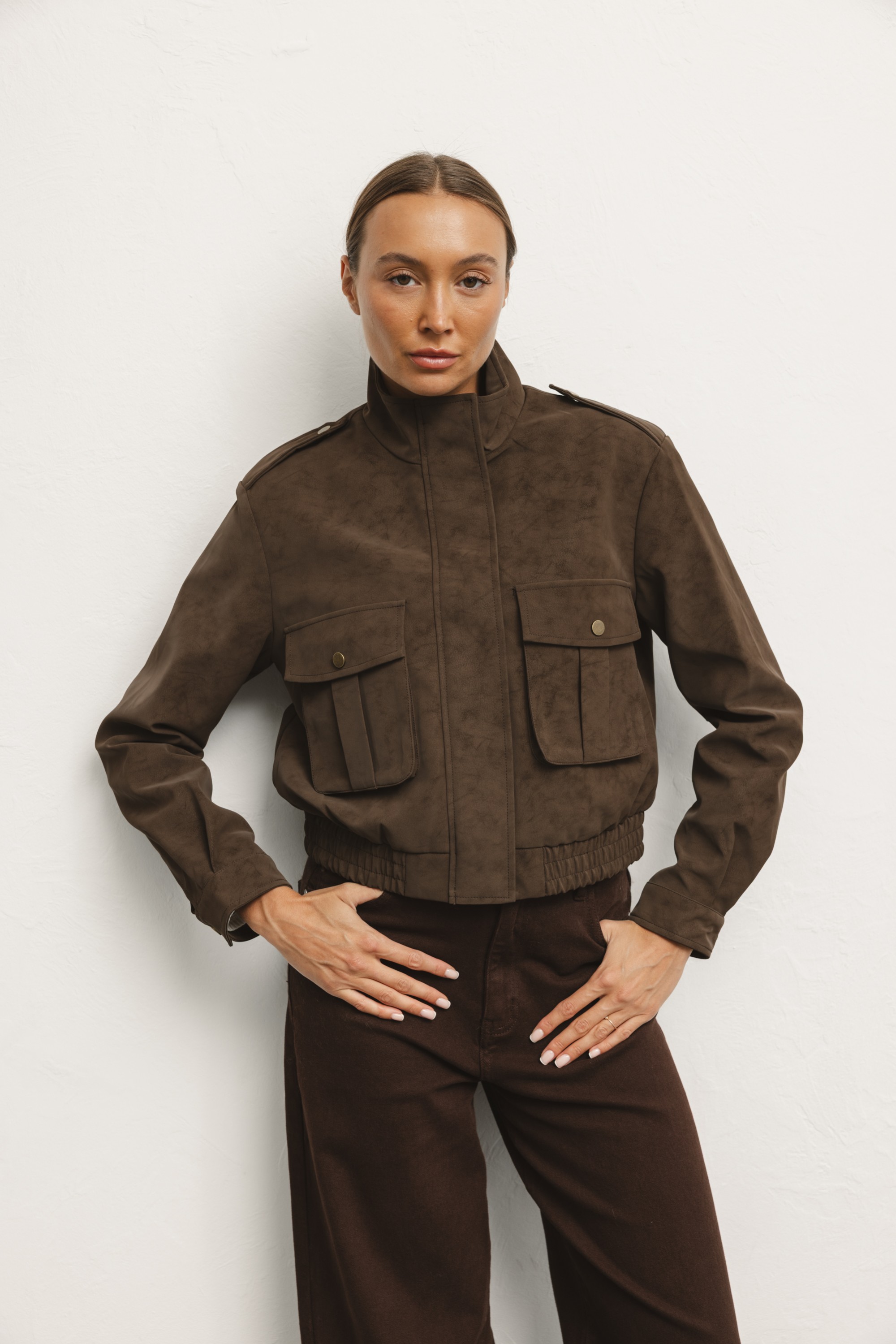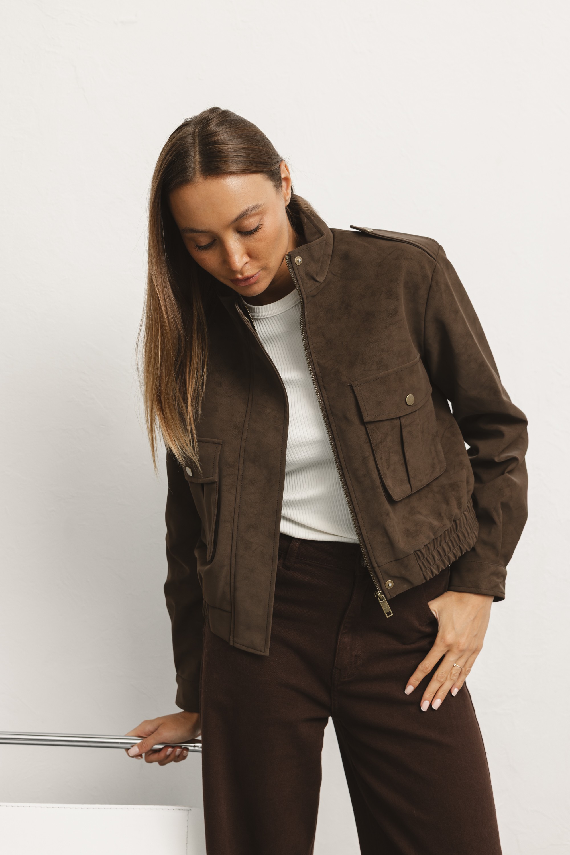 Stylowa kurtka o krótkim kroju, wykonana z imitacji zamszu. Wyposażona w duże kieszenie z patkami, pagony na ramionach oraz stójkę, która dodaje całości nowoczesnego charakteru. Elastyczny dół zapewnia wygodę i świetne dopasowanie. Idealna propozycja na jesień i wiosnę – łatwa do łączenia z jeansami czy spodniami materiałowymi.