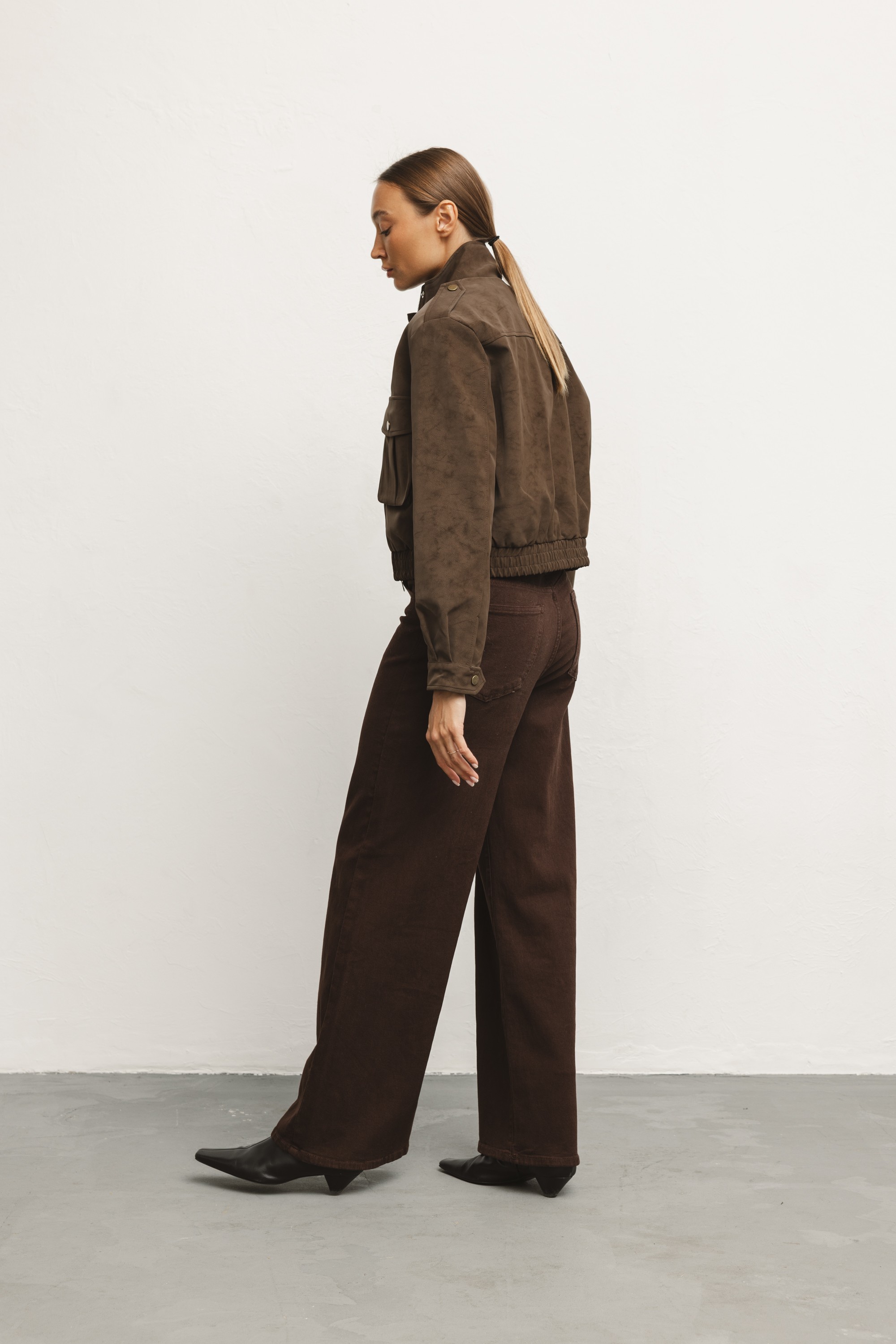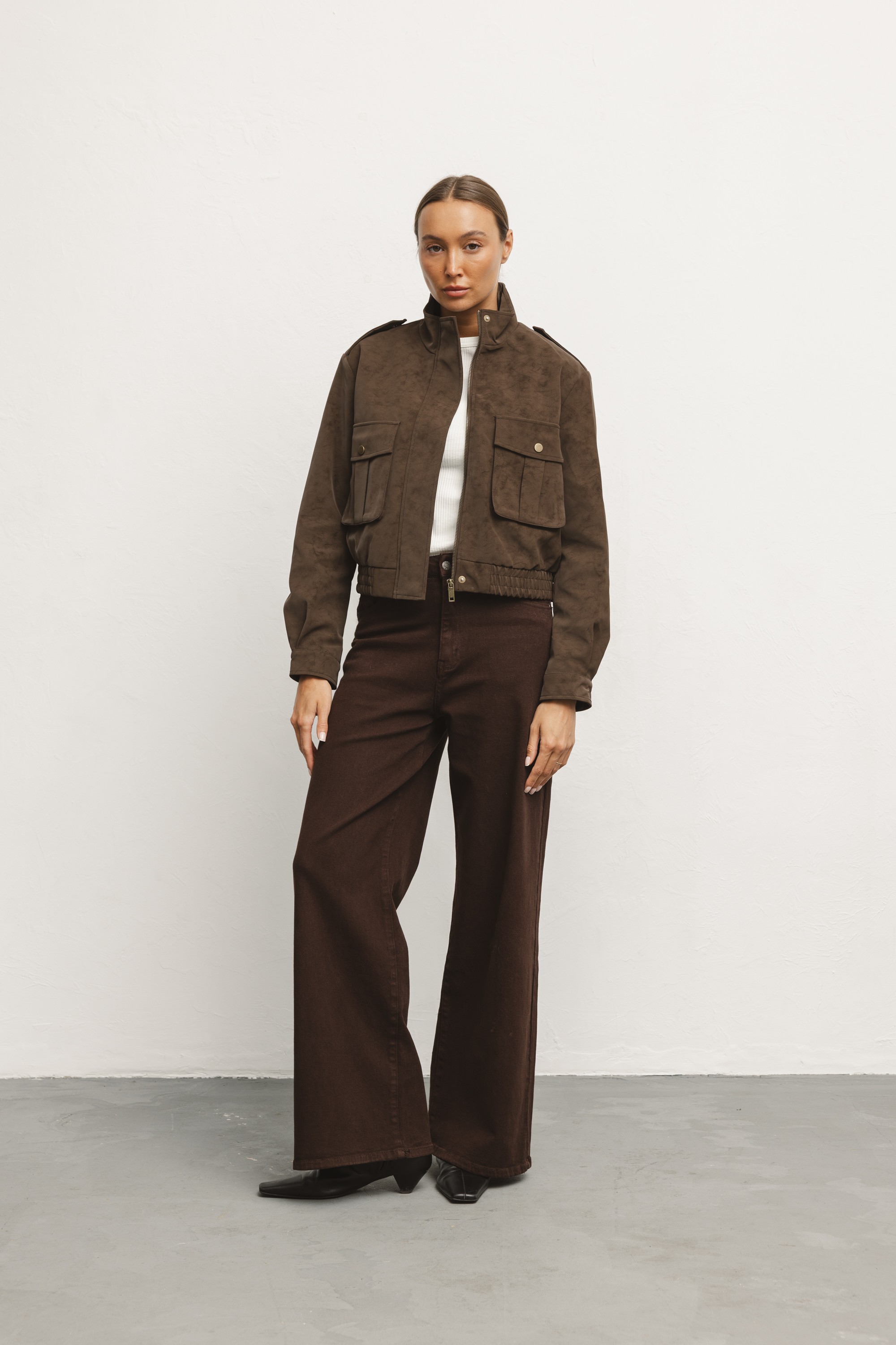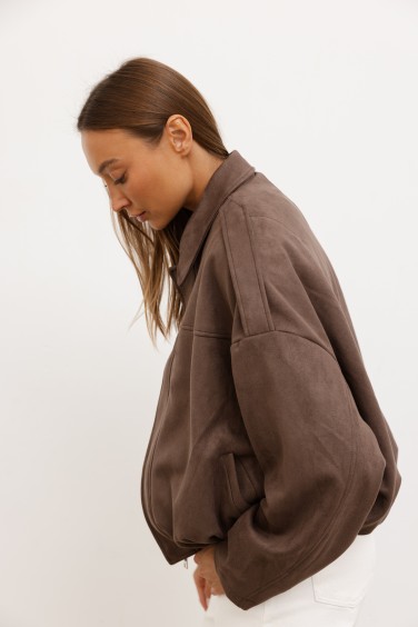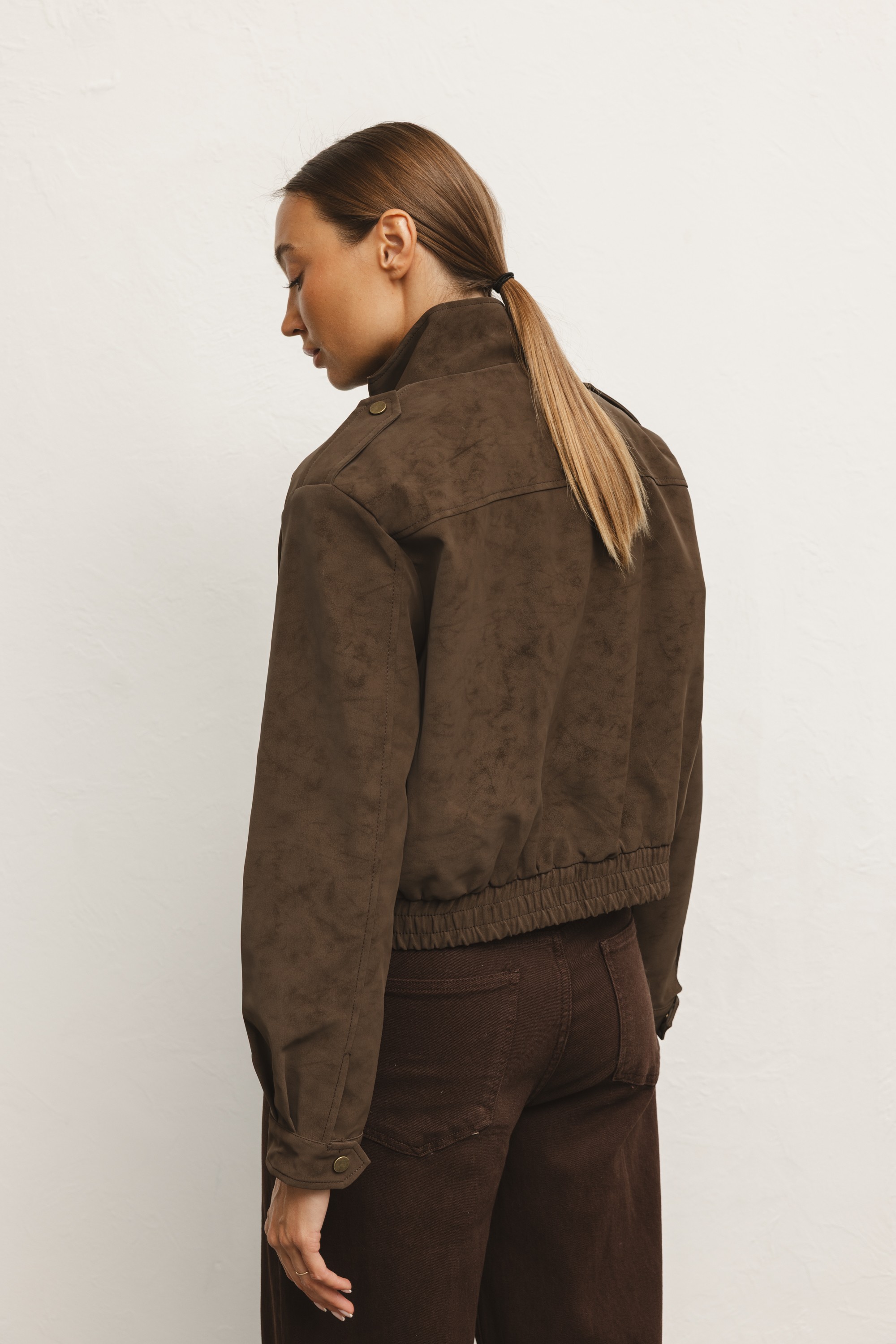 Stylowa kurtka o krótkim kroju, wykonana z imitacji zamszu. Wyposażona w duże kieszenie z patkami, pagony na ramionach oraz stójkę, która dodaje całości nowoczesnego charakteru. Elastyczny dół zapewnia wygodę i świetne dopasowanie. Idealna propozycja na jesień i wiosnę – łatwa do łączenia z jeansami czy spodniami materiałowymi.