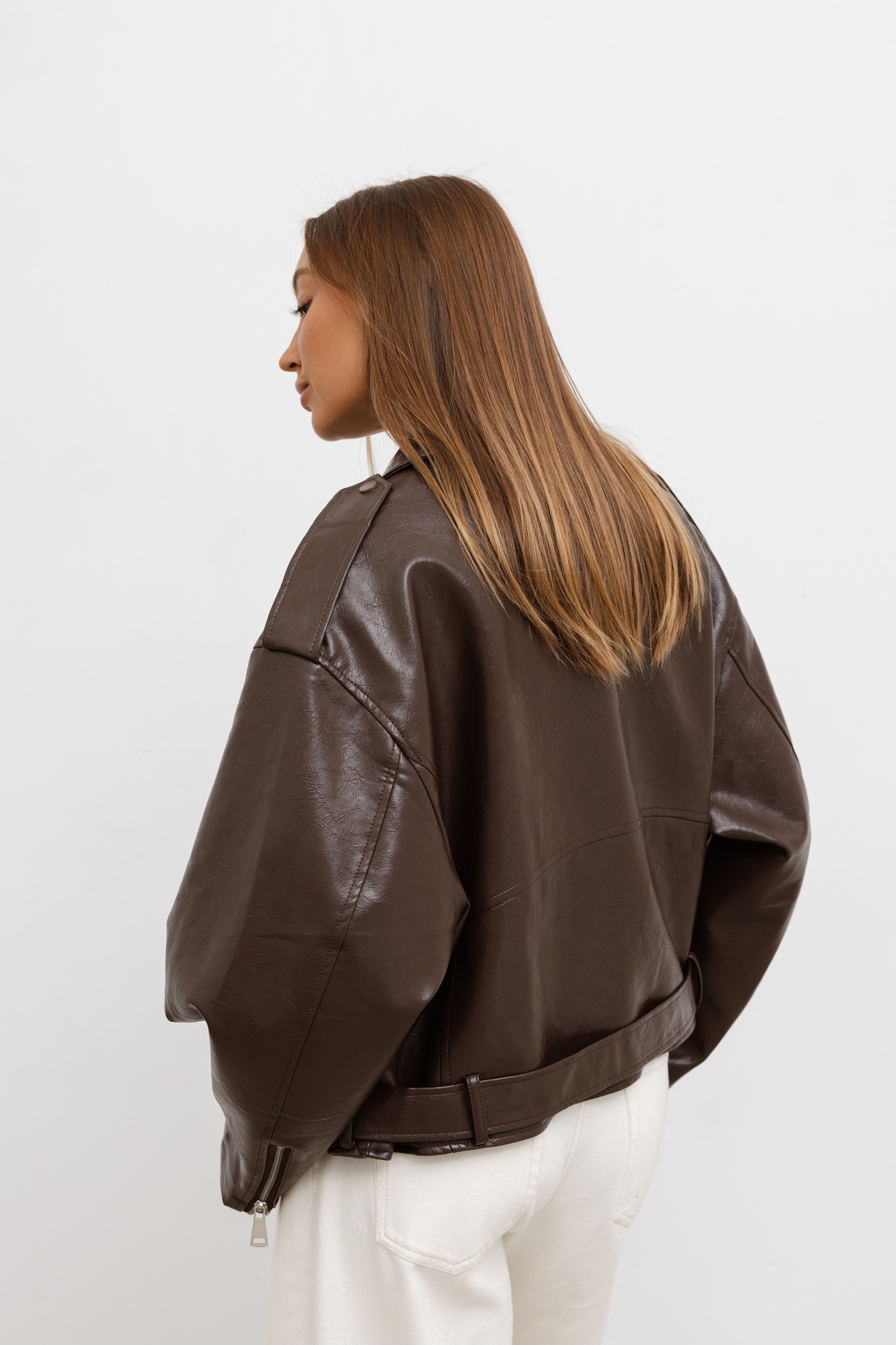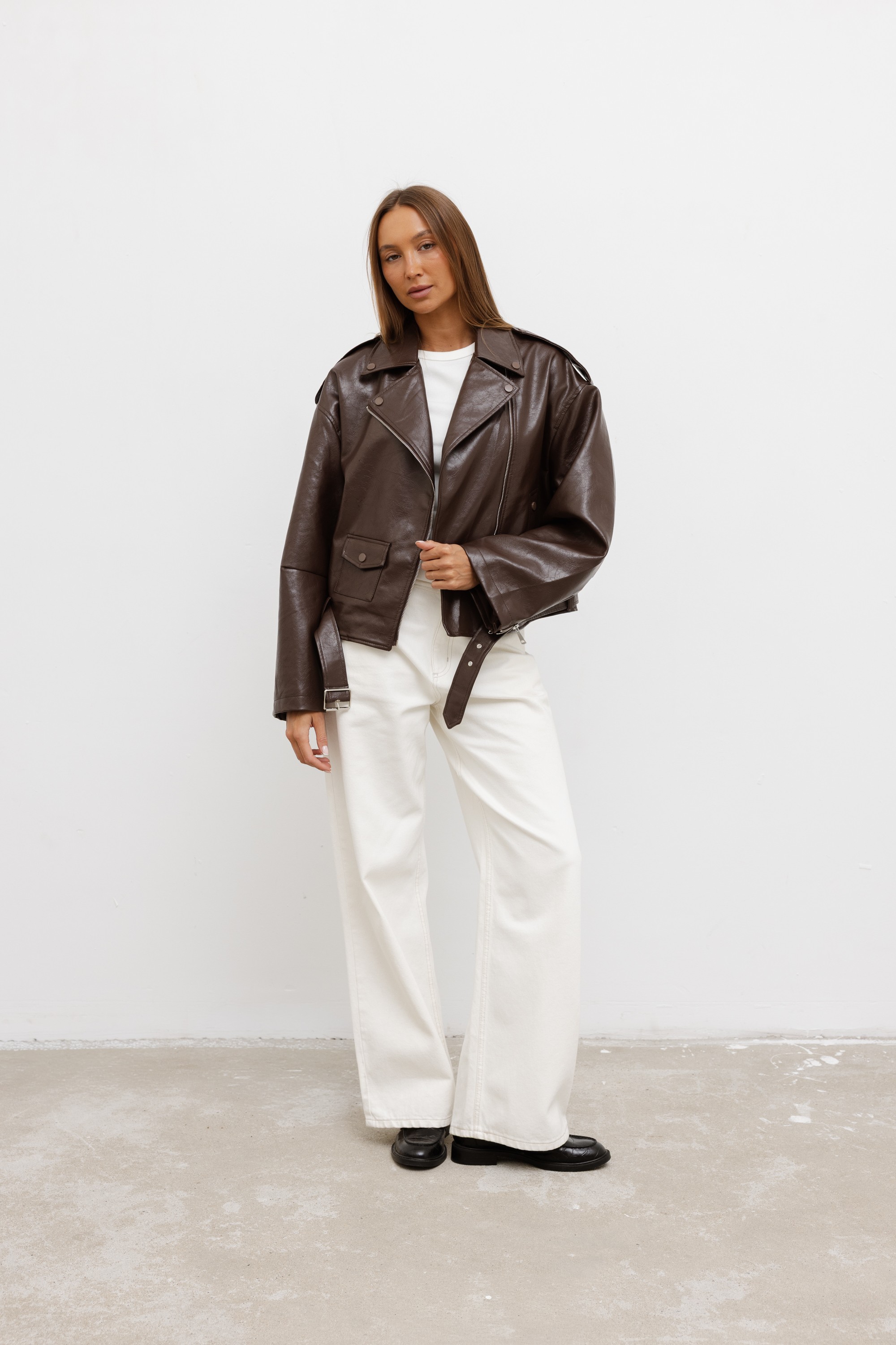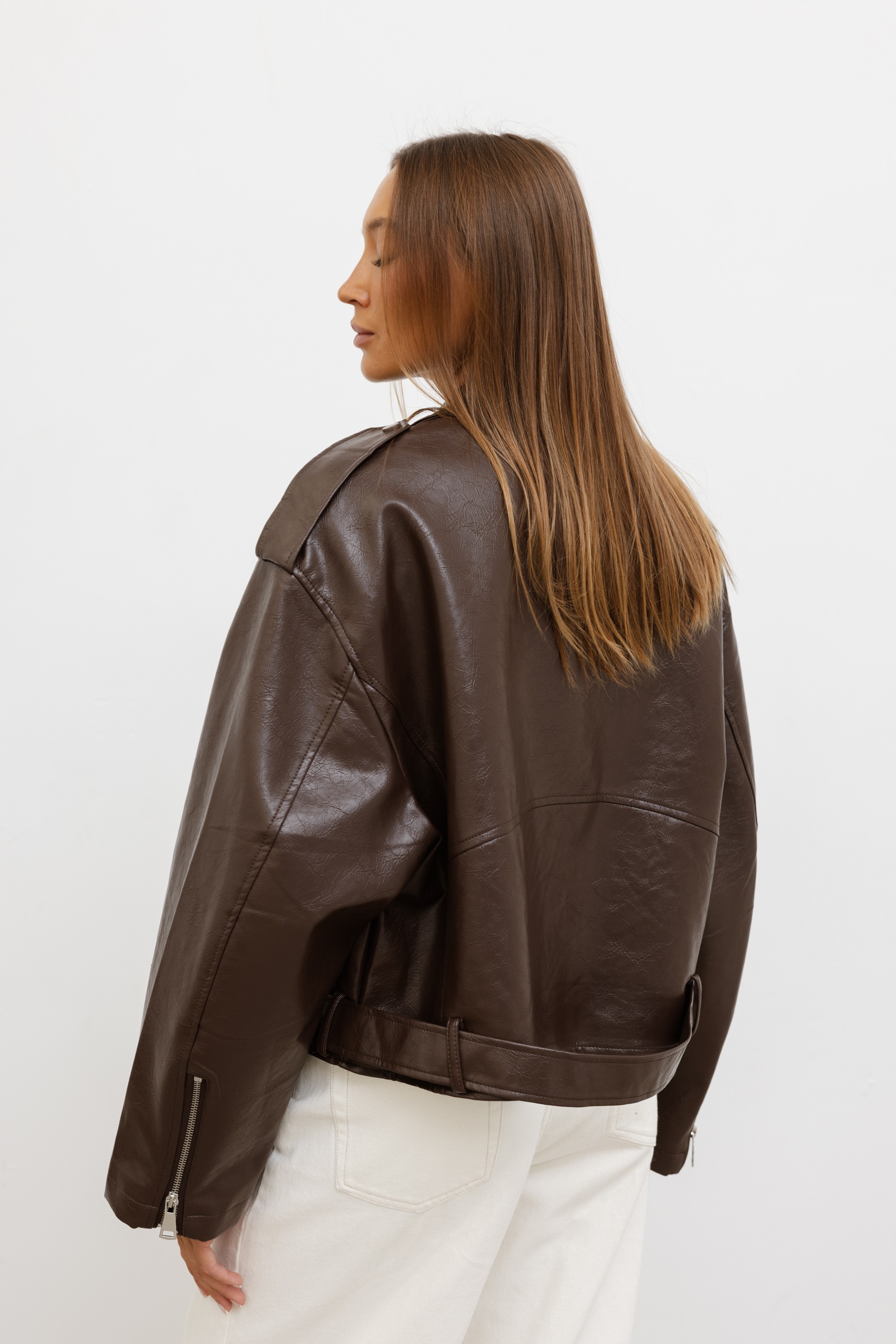 Klasyczna ramoneska w nowoczesnym wydaniu, uszyta z wysokiej jakości ekoskóry. Charakterystyczny krój z asymetrycznym zamkiem, dużymi klapami i paskiem w talii dodaje całości rockowego charakteru. Luźniejszy fason sprawia, że kurtka świetnie wygląda zarówno w casualowych, jak i bardziej wyrazistych stylizacjach.