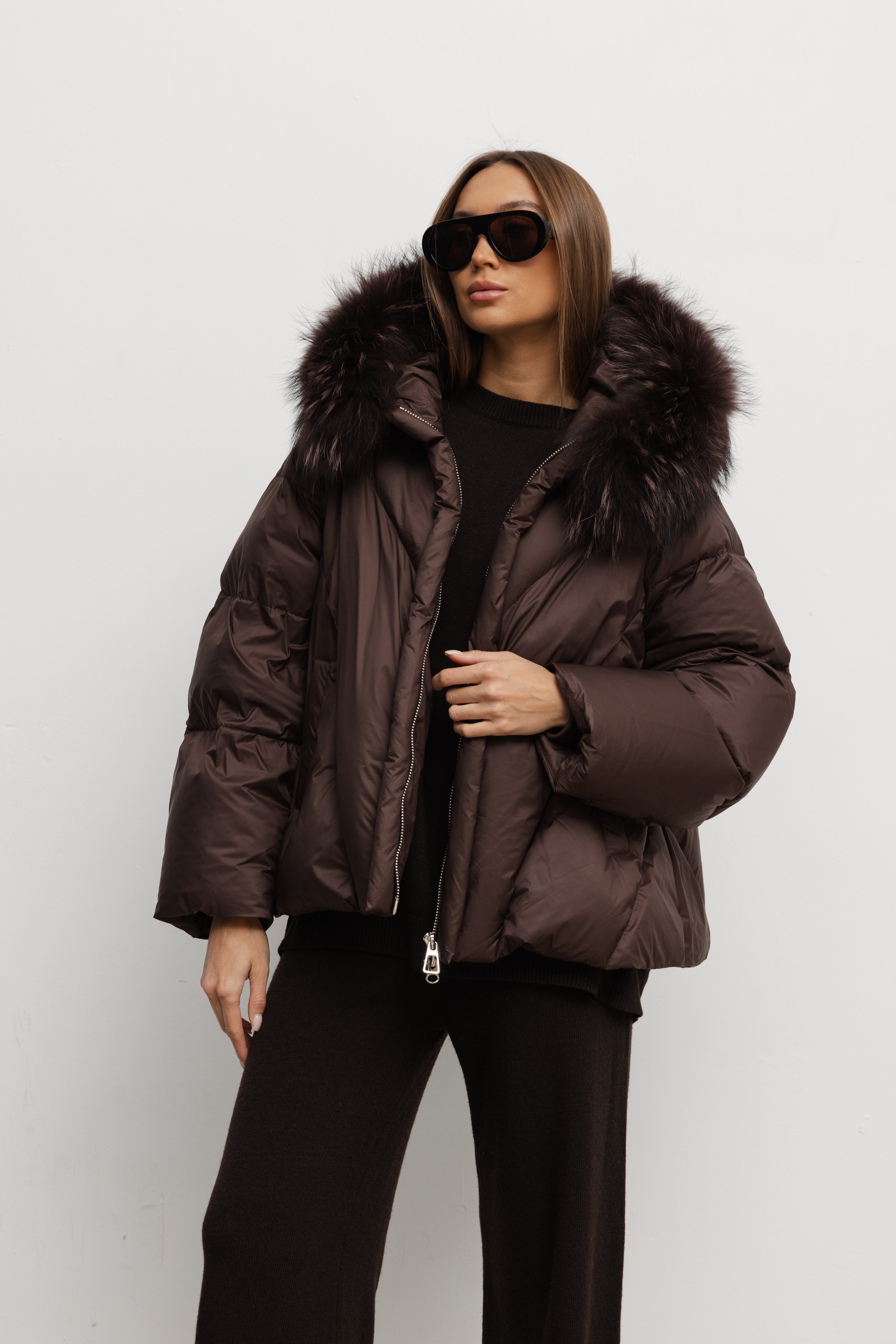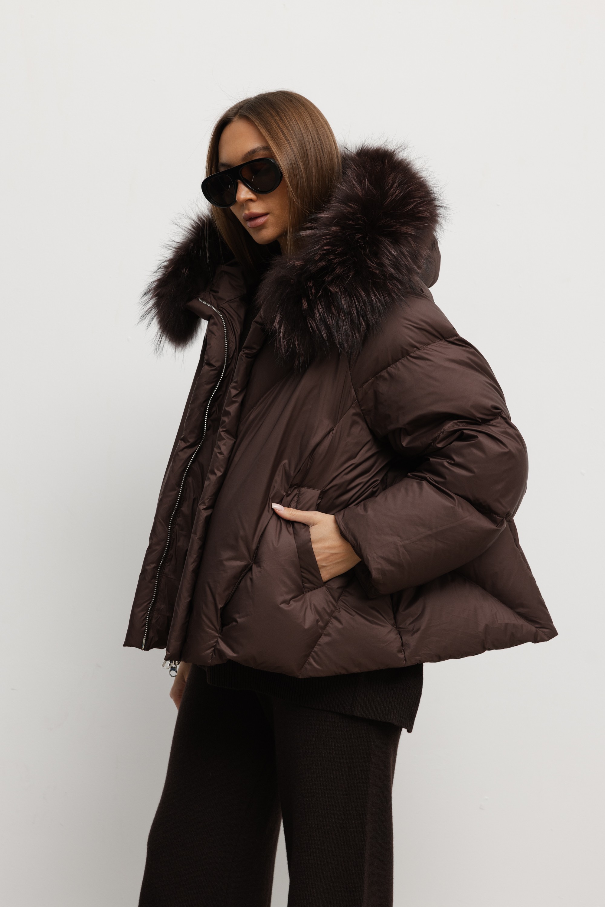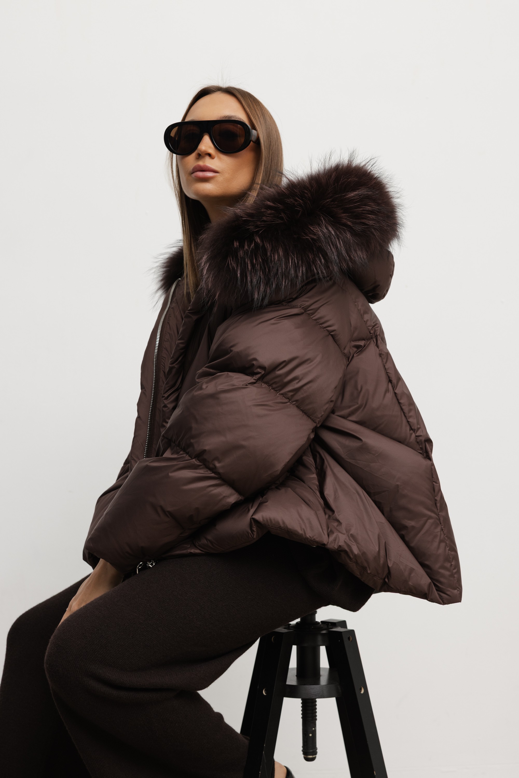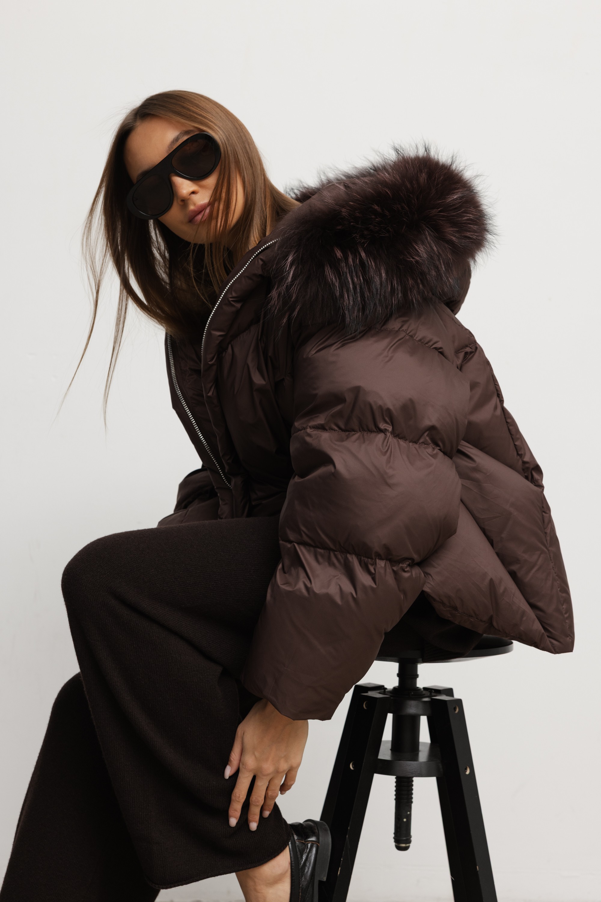 Krótka puchowa kurtka o nowoczesnym, lekko oversize’owym kroju. Model wyróżnia efektowny kaptur wykończony naturalnym futrem, proste pikowania oraz praktyczne kieszenie. Idealna do miejskich, eleganckich stylizacji, dodaje sylwetce wyrazistości i modowego charakteru.