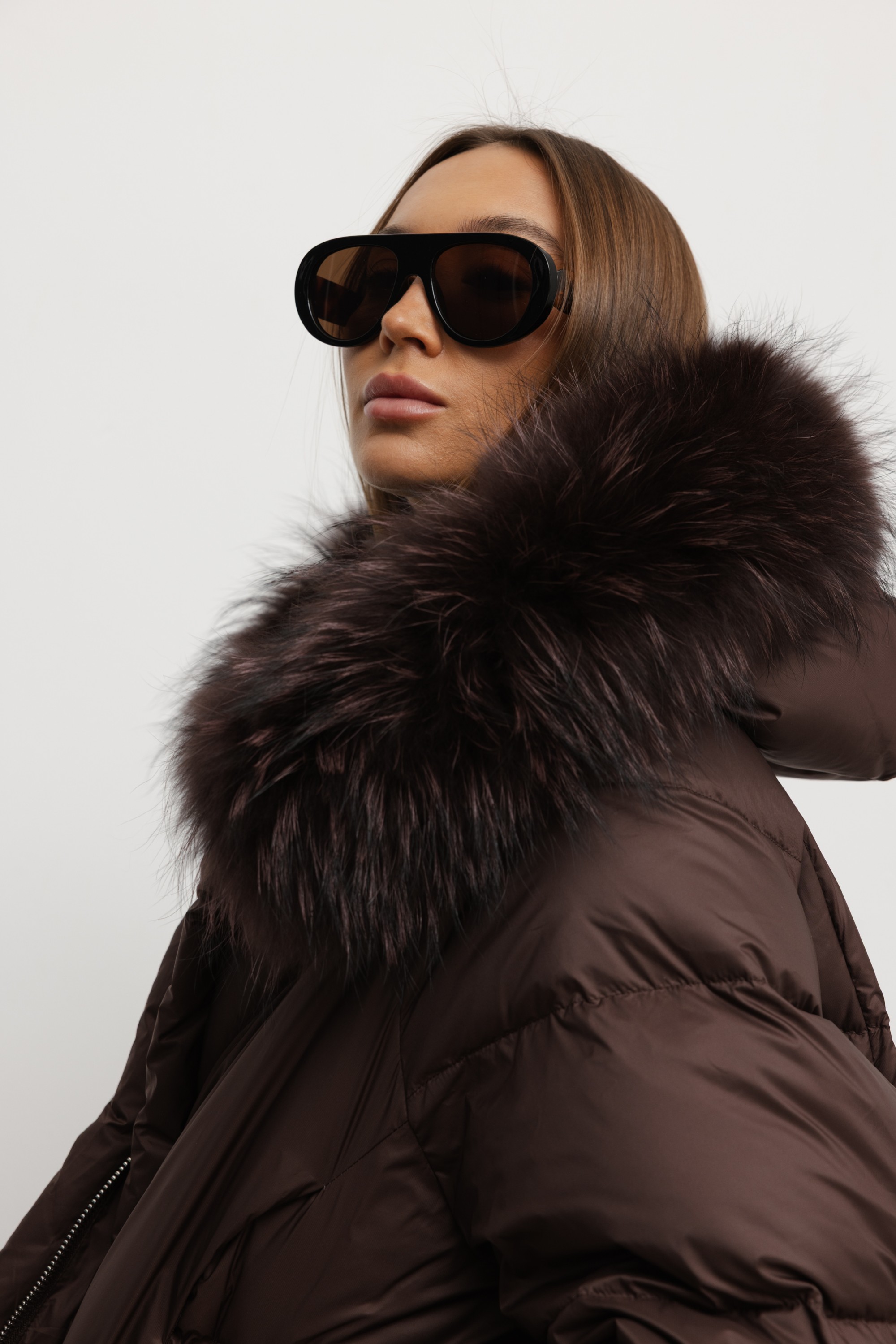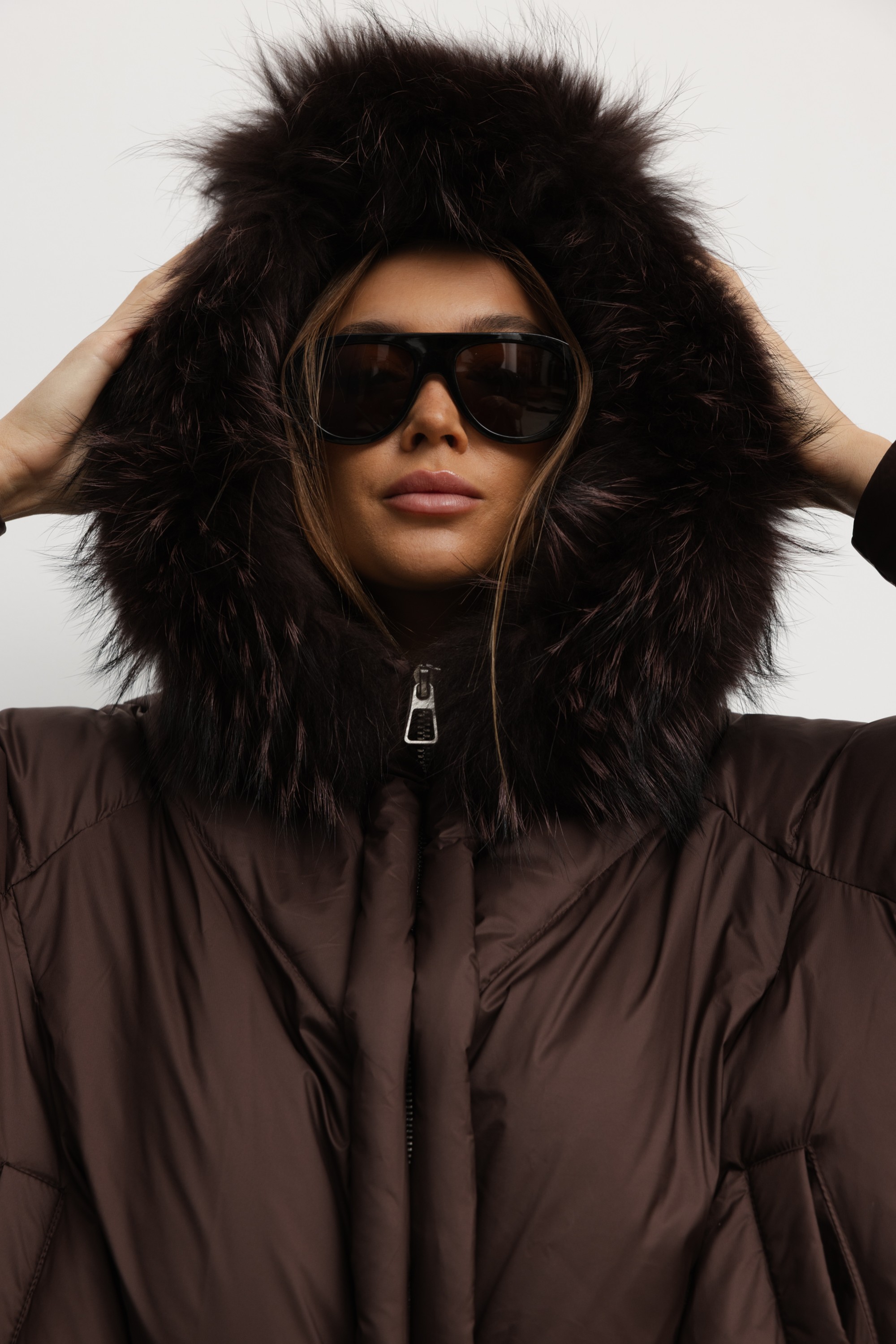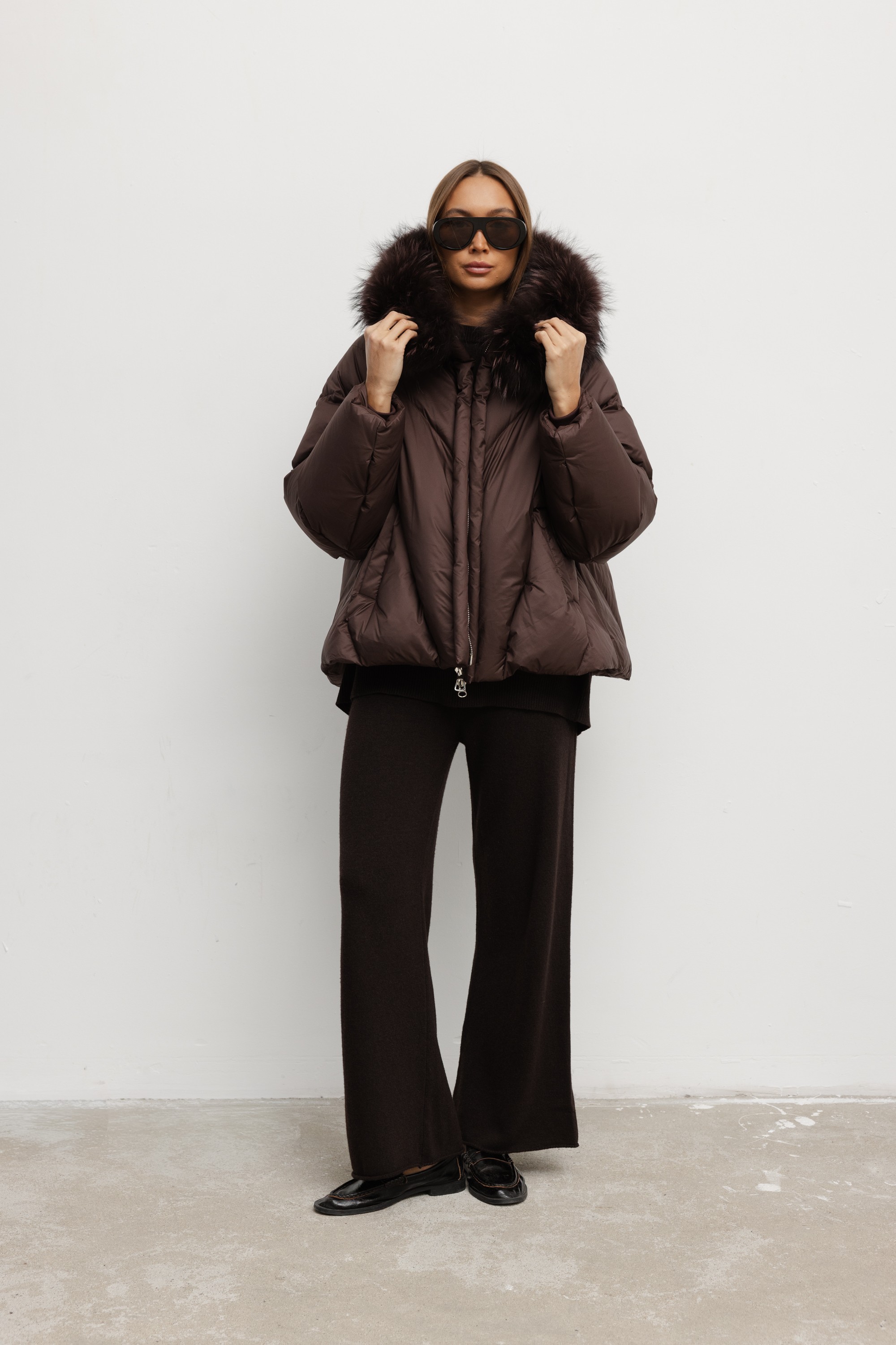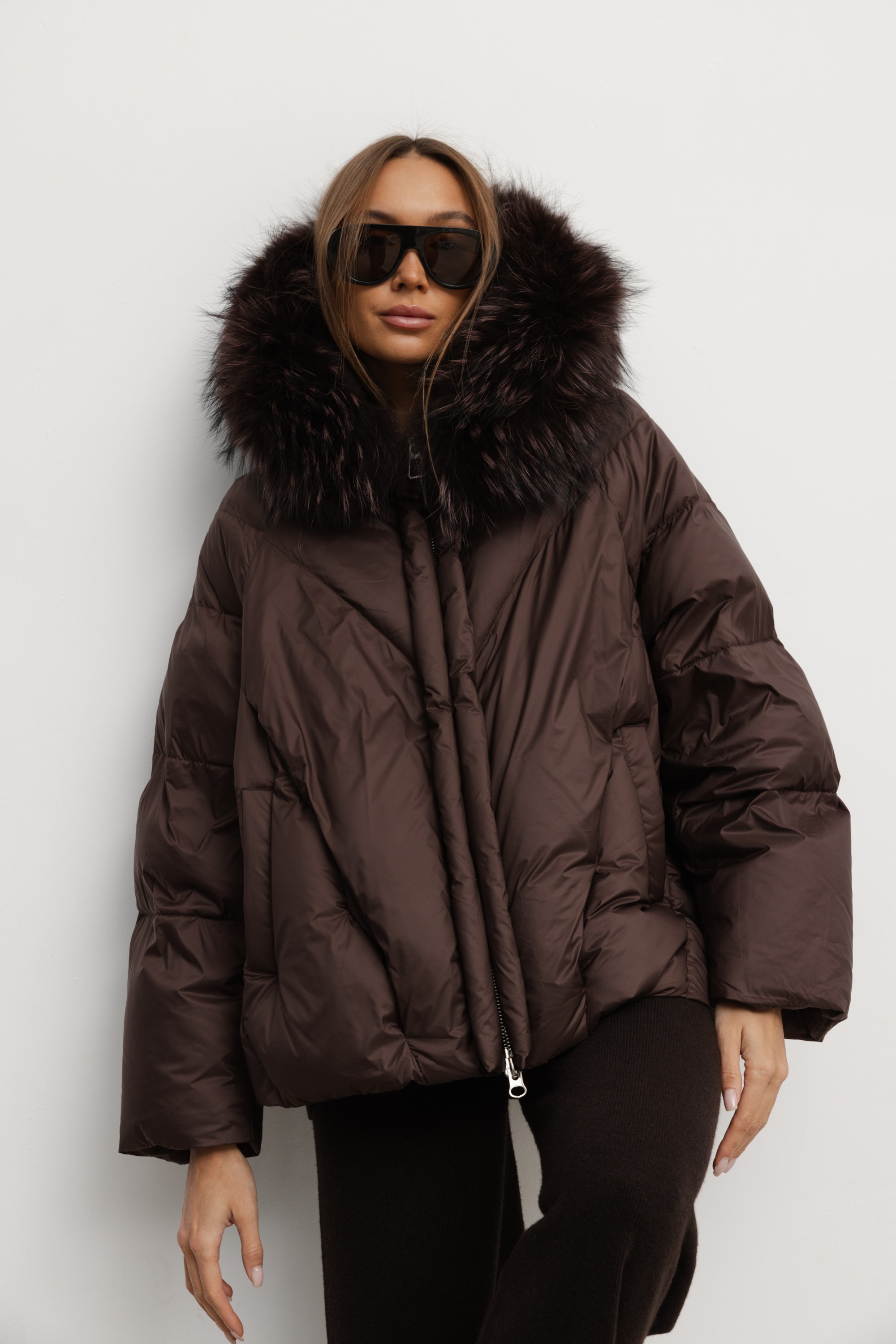 Krótka puchowa kurtka o nowoczesnym, lekko oversize’owym kroju. Model wyróżnia efektowny kaptur wykończony naturalnym futrem, proste pikowania oraz praktyczne kieszenie. Idealna do miejskich, eleganckich stylizacji, dodaje sylwetce wyrazistości i modowego charakteru.