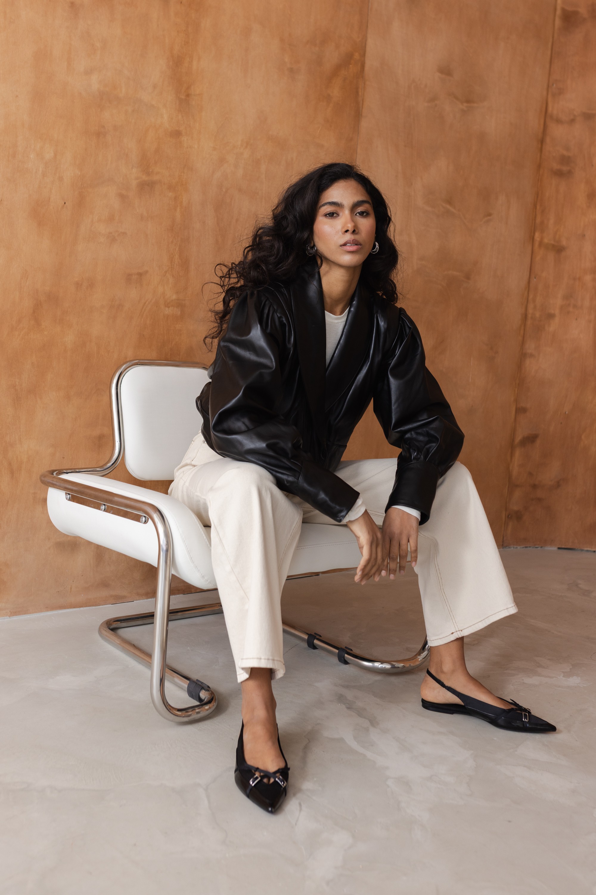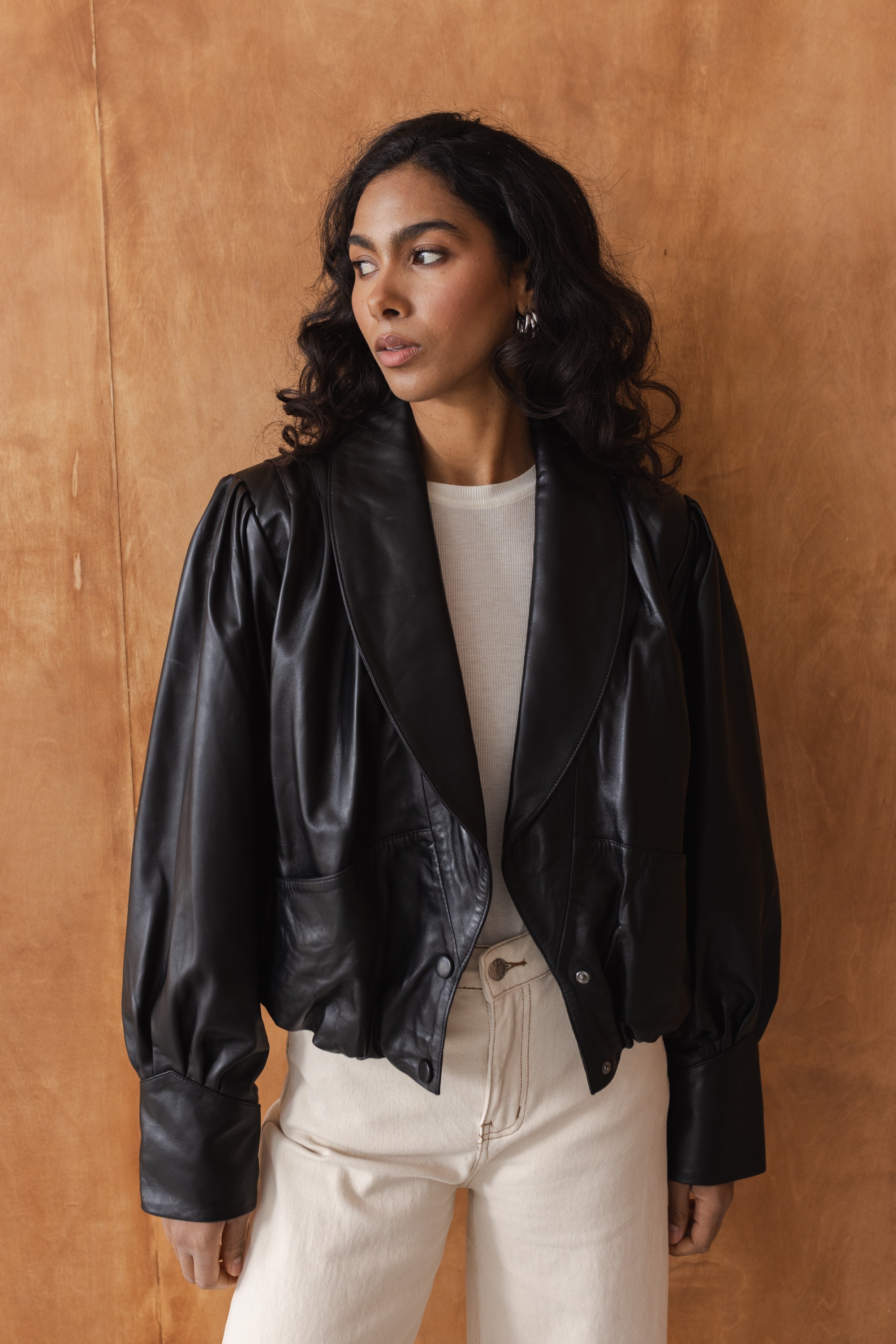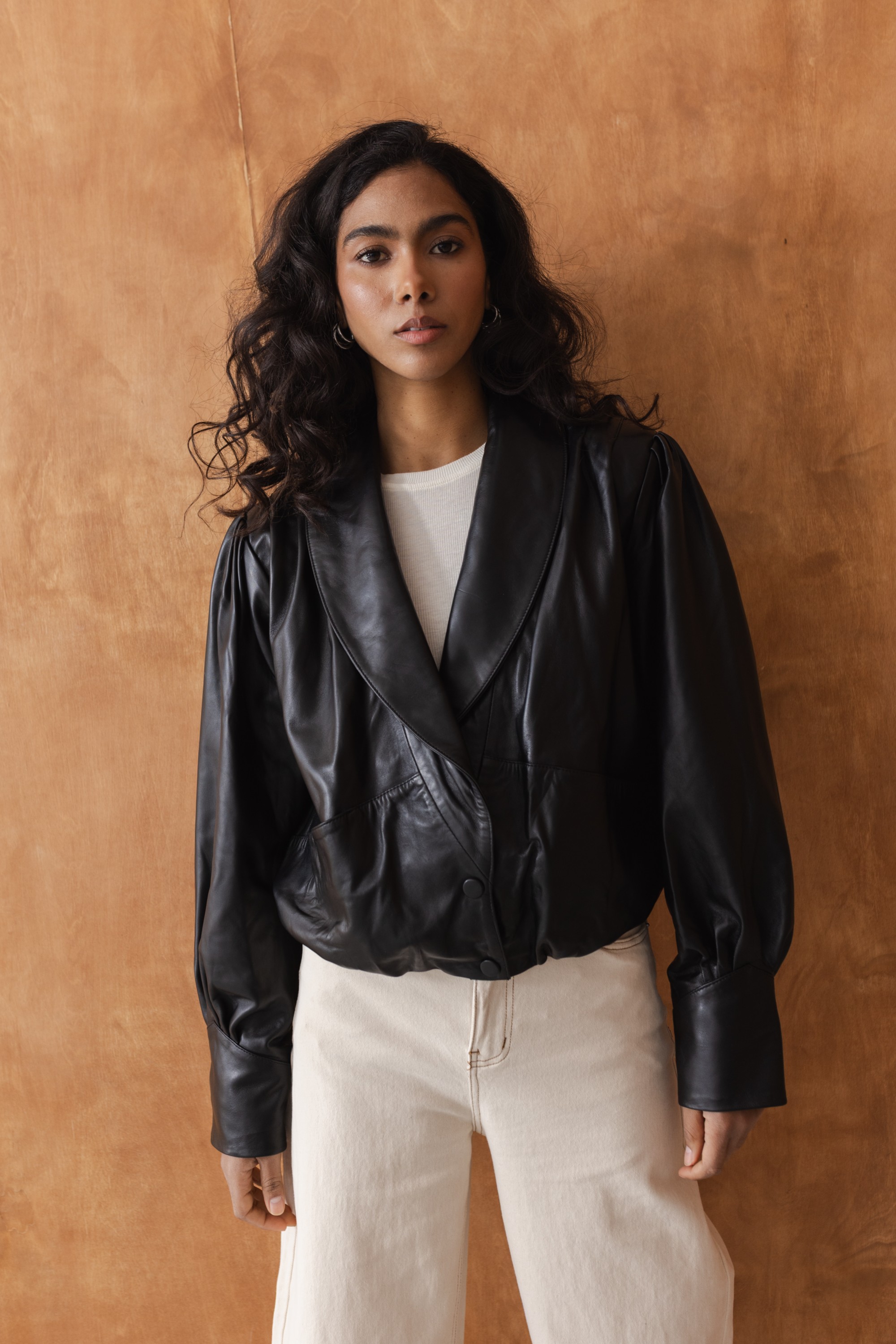 Charakterystyczne marszczenia oraz delikatnie bufiaste rękawy nadają kurtce kobiecego, nowoczesnego charakteru, a szerokie klapy wprowadzają nutę klasyki inspirowanej marynarką. To idealna czarna kurtka skórzana do codziennych stylizacji, jak i bardziej eleganckich zestawów.