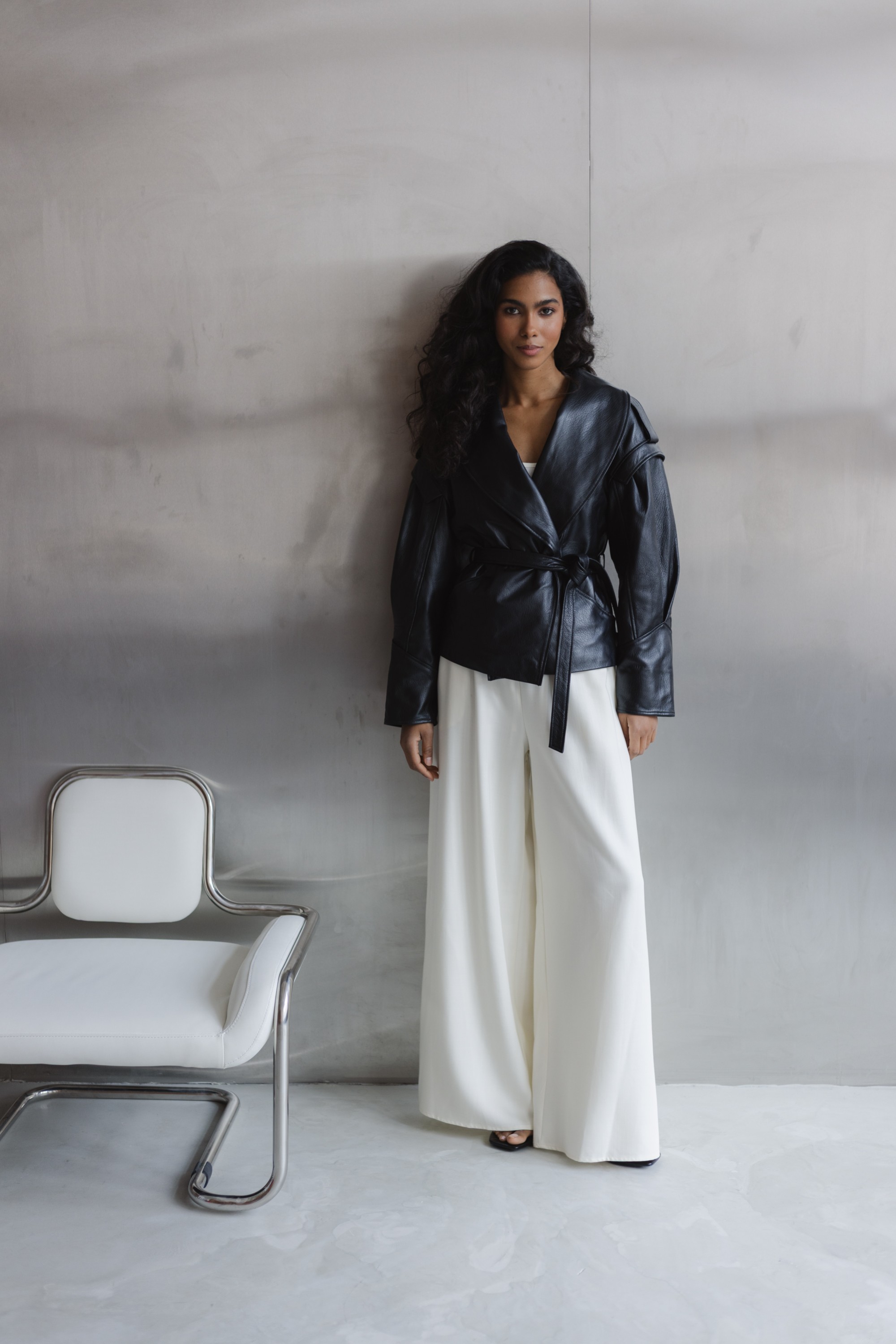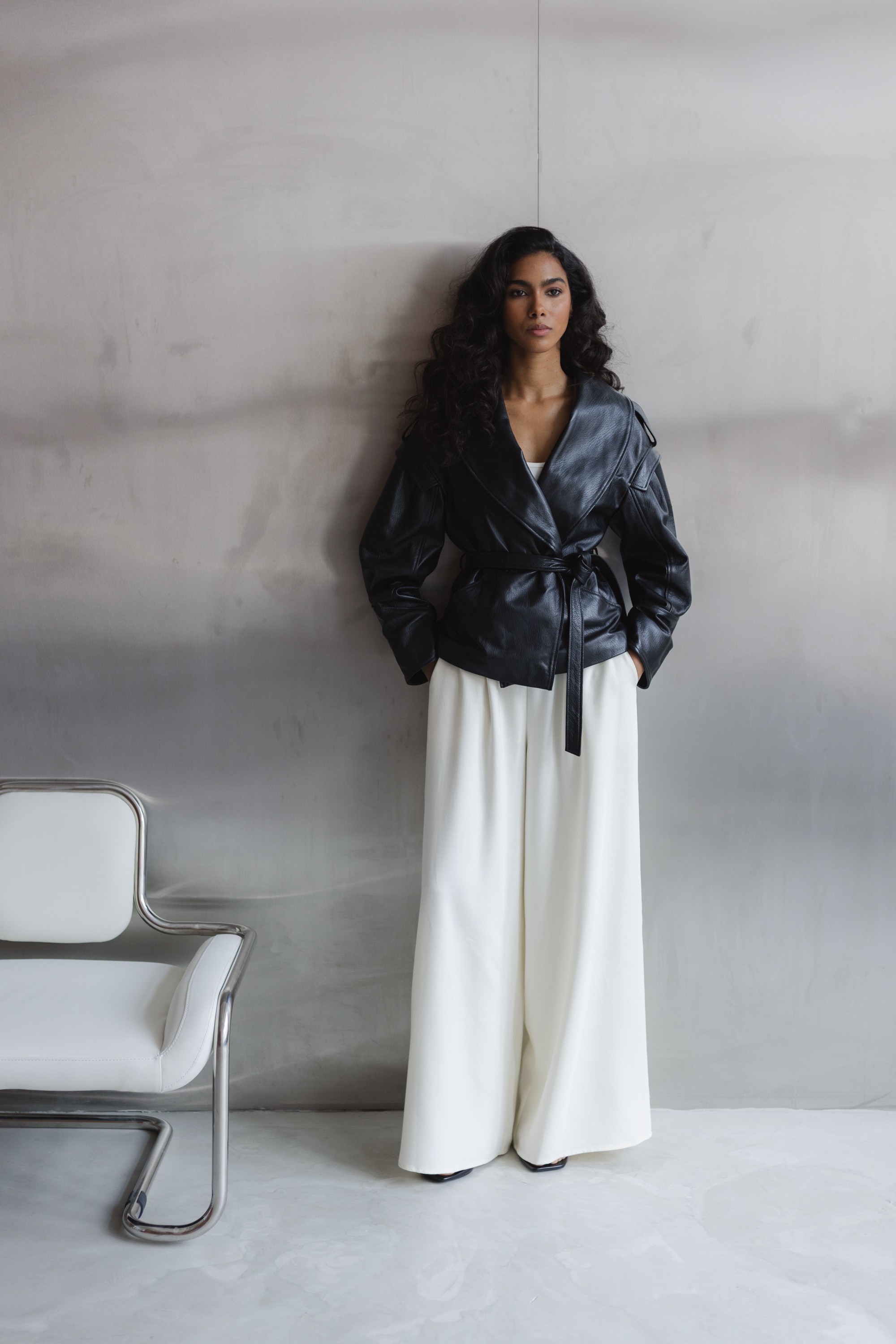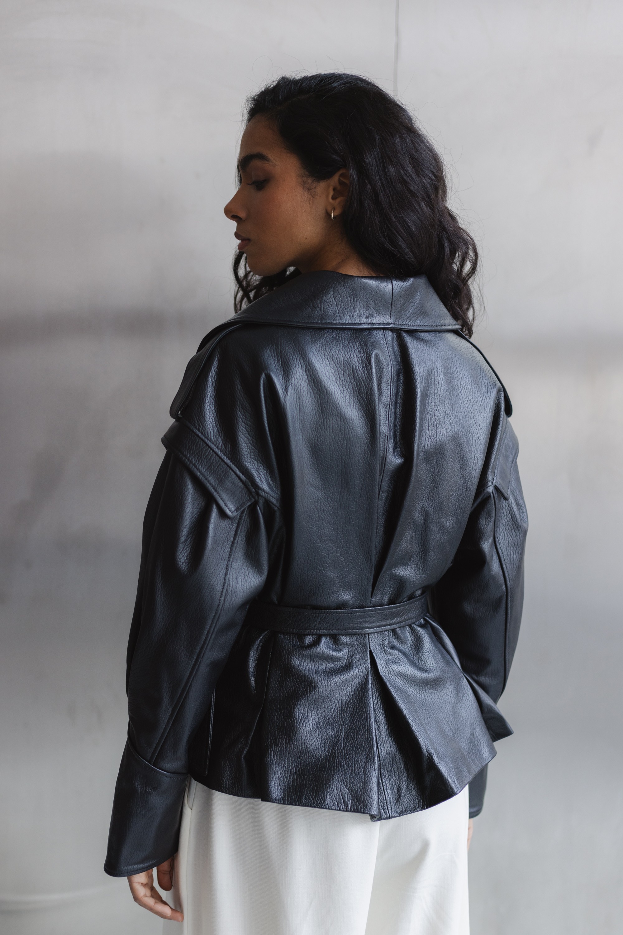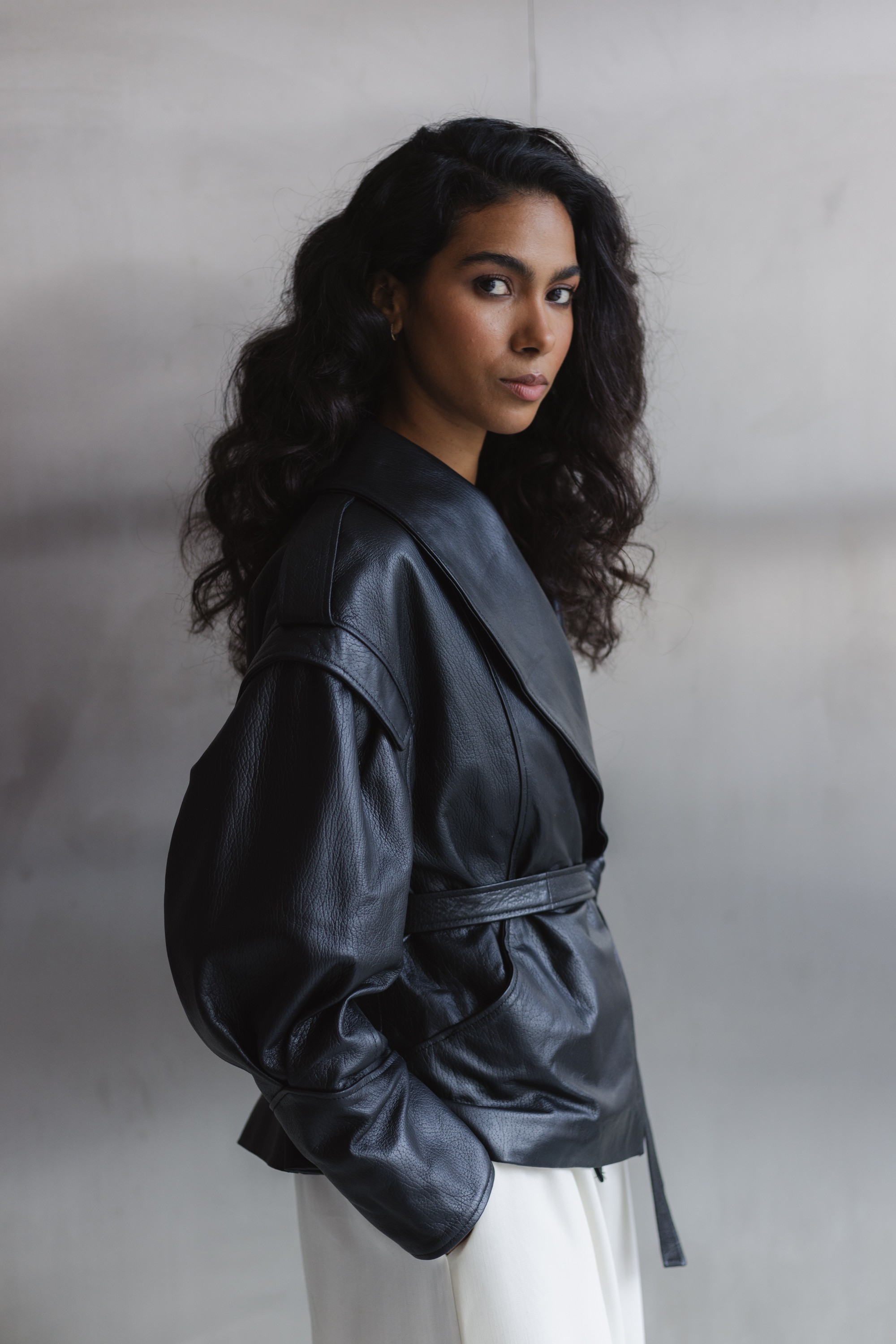 Stylowa kurtka wykonana z wysokiej jakości skóry naturalnej, która łączy nowoczesny design z ponadczasową klasyką. Model o lekko oversize’owym kroju z wyraźnie zaznaczoną linią ramion i szerokimi klapami nadaje sylwetce charakteru, a pasek w talii pozwala na indywidualne dopasowanie i podkreślenie kobiecej figury.