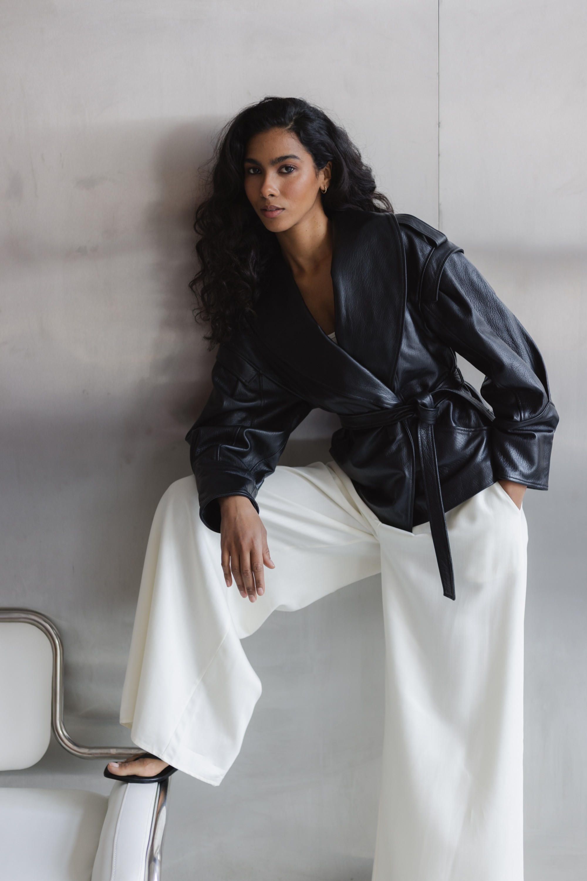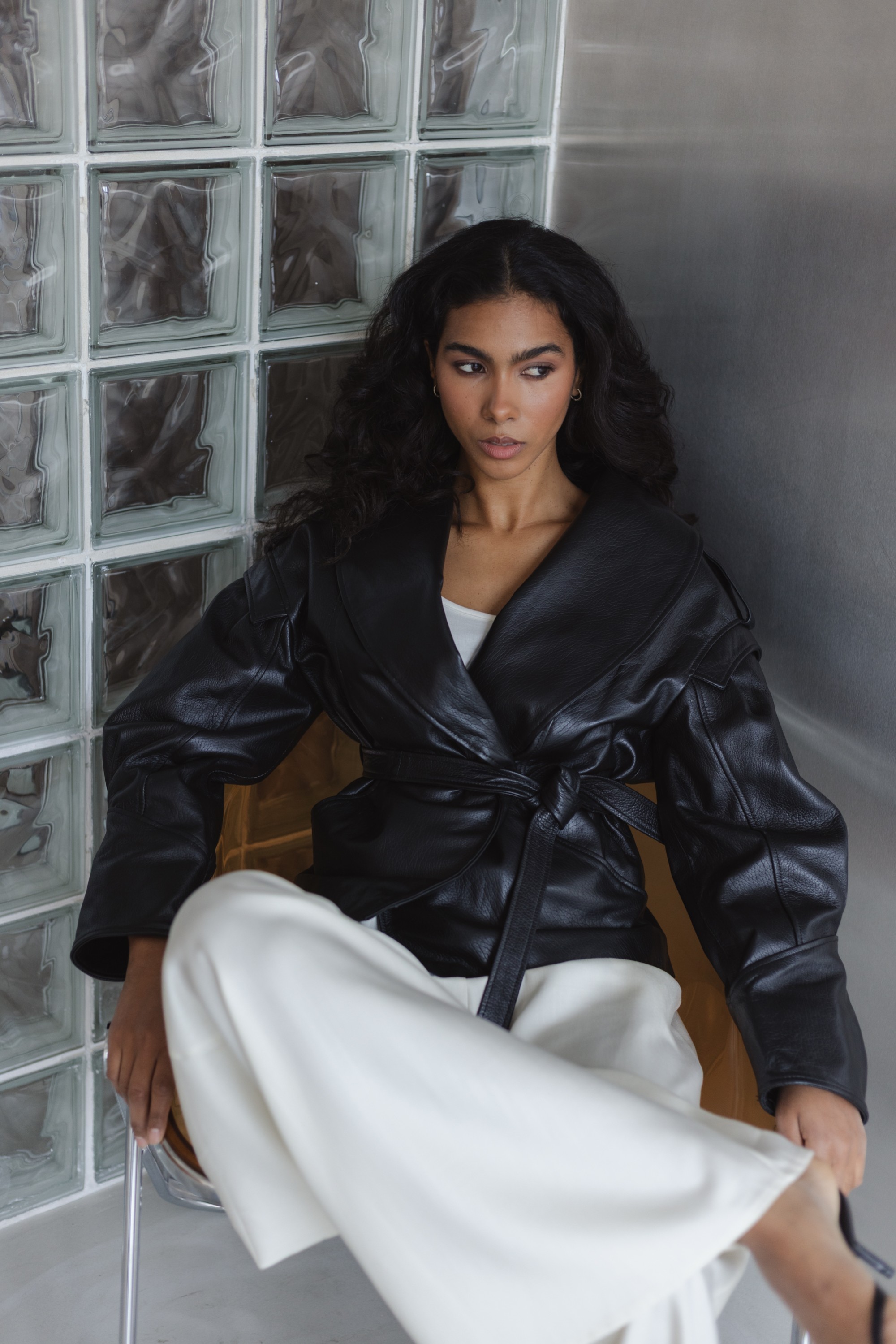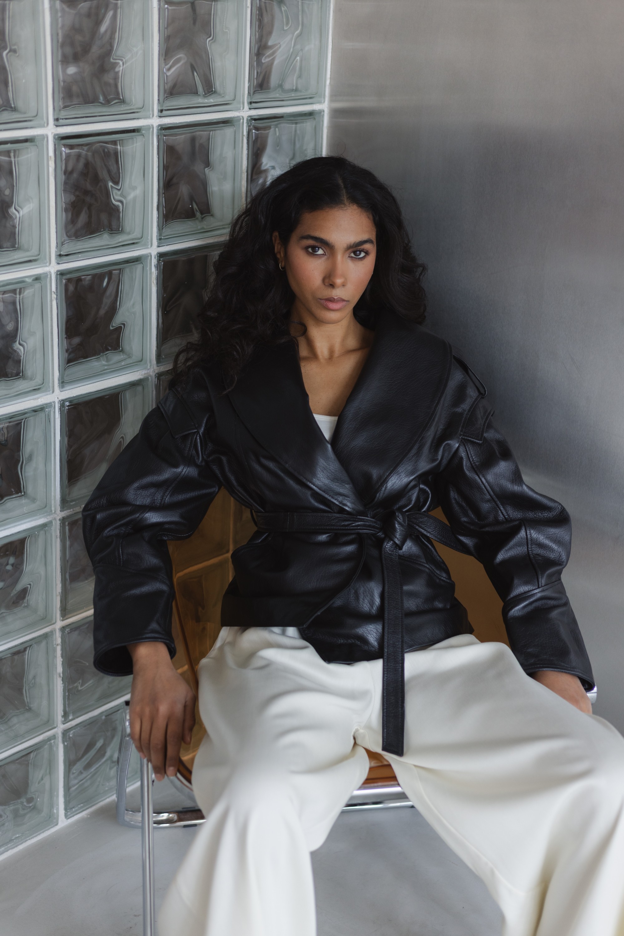Stylowa kurtka wykonana z wysokiej jakości skóry naturalnej, która łączy nowoczesny design z ponadczasową klasyką. Model o lekko oversize’owym kroju z wyraźnie zaznaczoną linią ramion i szerokimi klapami nadaje sylwetce charakteru, a pasek w talii pozwala na indywidualne dopasowanie i podkreślenie kobiecej figury.