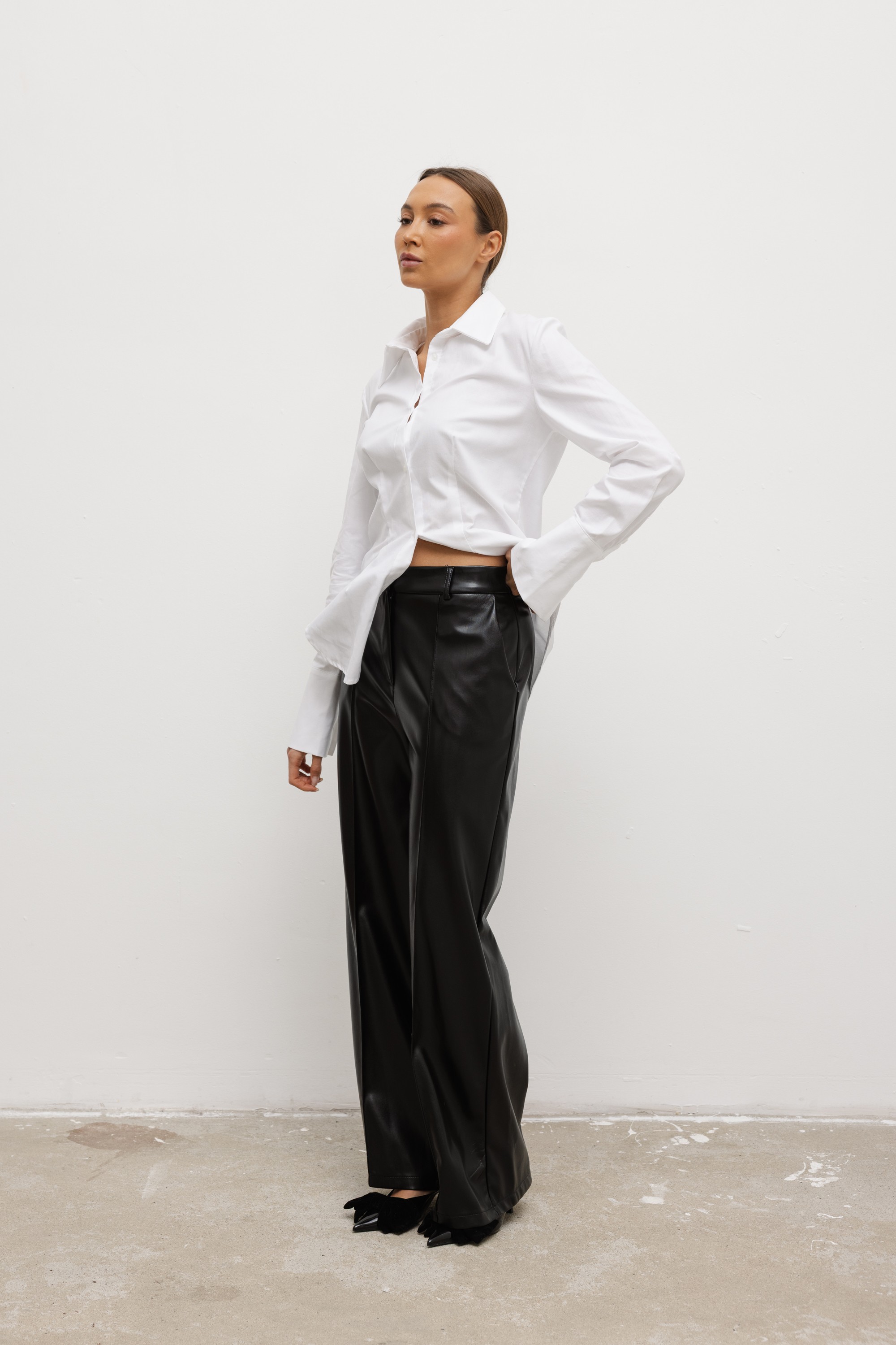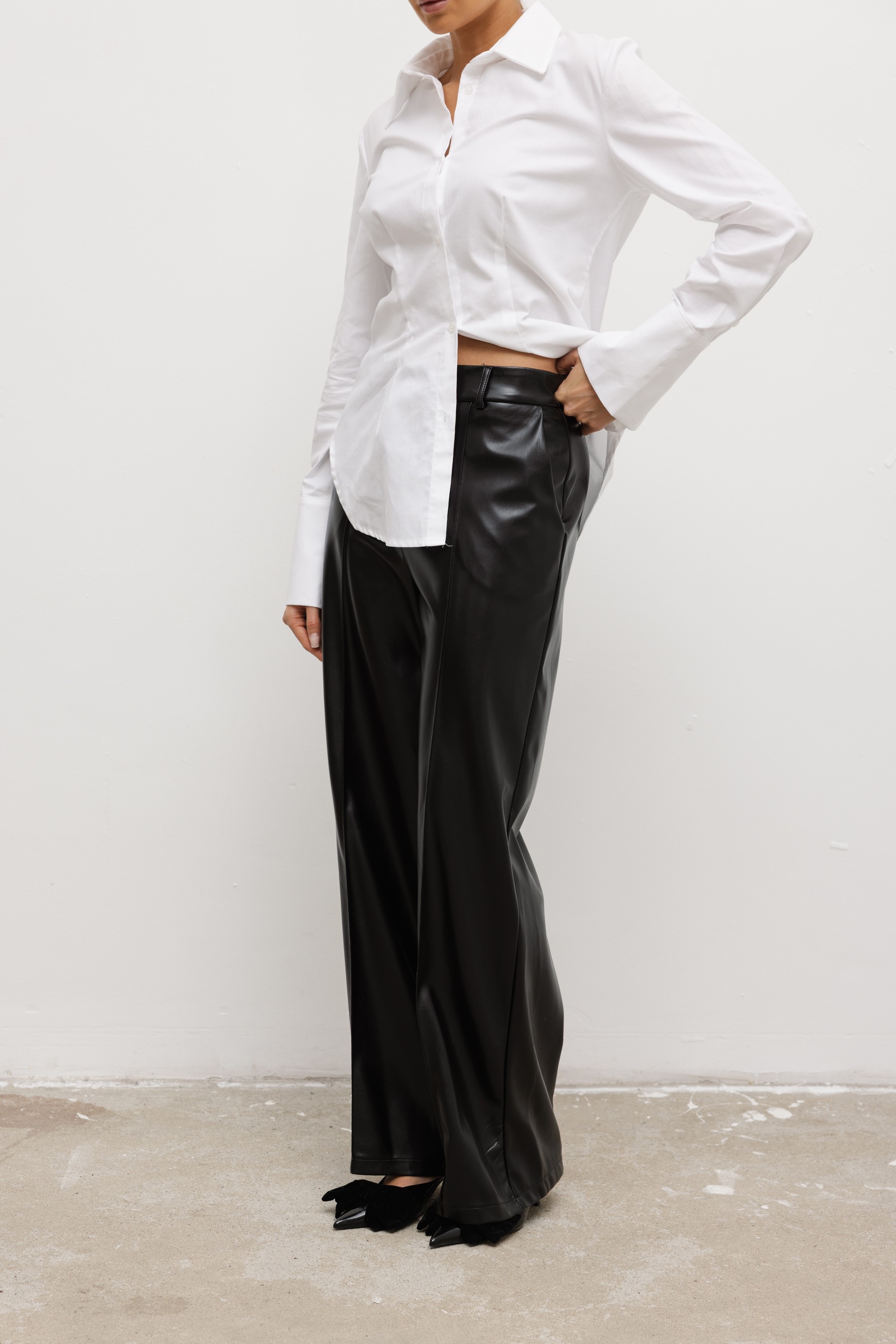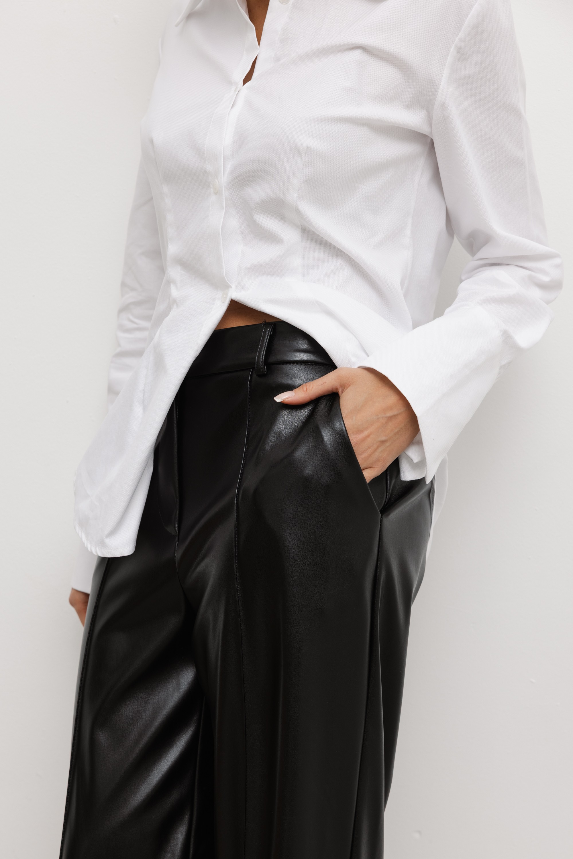 Spodnie z eko skóry o szerokiej nogawce i wysokim stanie, które łączą nowoczesny charakter z klasyczną linią. Pionowe przeszycie dodaje wyrazistego looku, a minimalistyczny krój sprawia, że świetnie komponują się zarówno z dopasowanymi, jak i oversize’owymi górami. Uniwersalny model, który podkreśla sylwetkę i dodaje stylizacjom odważnego akcentu.