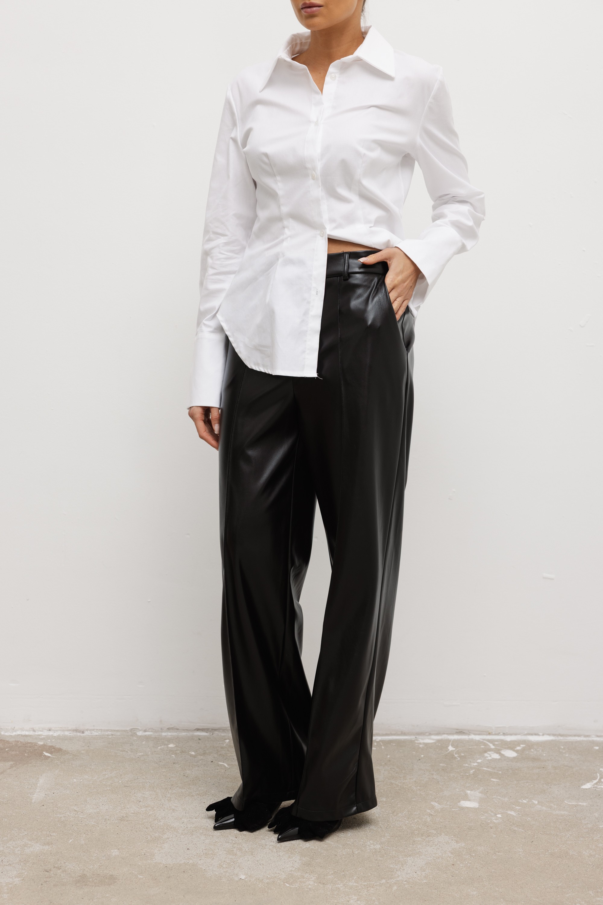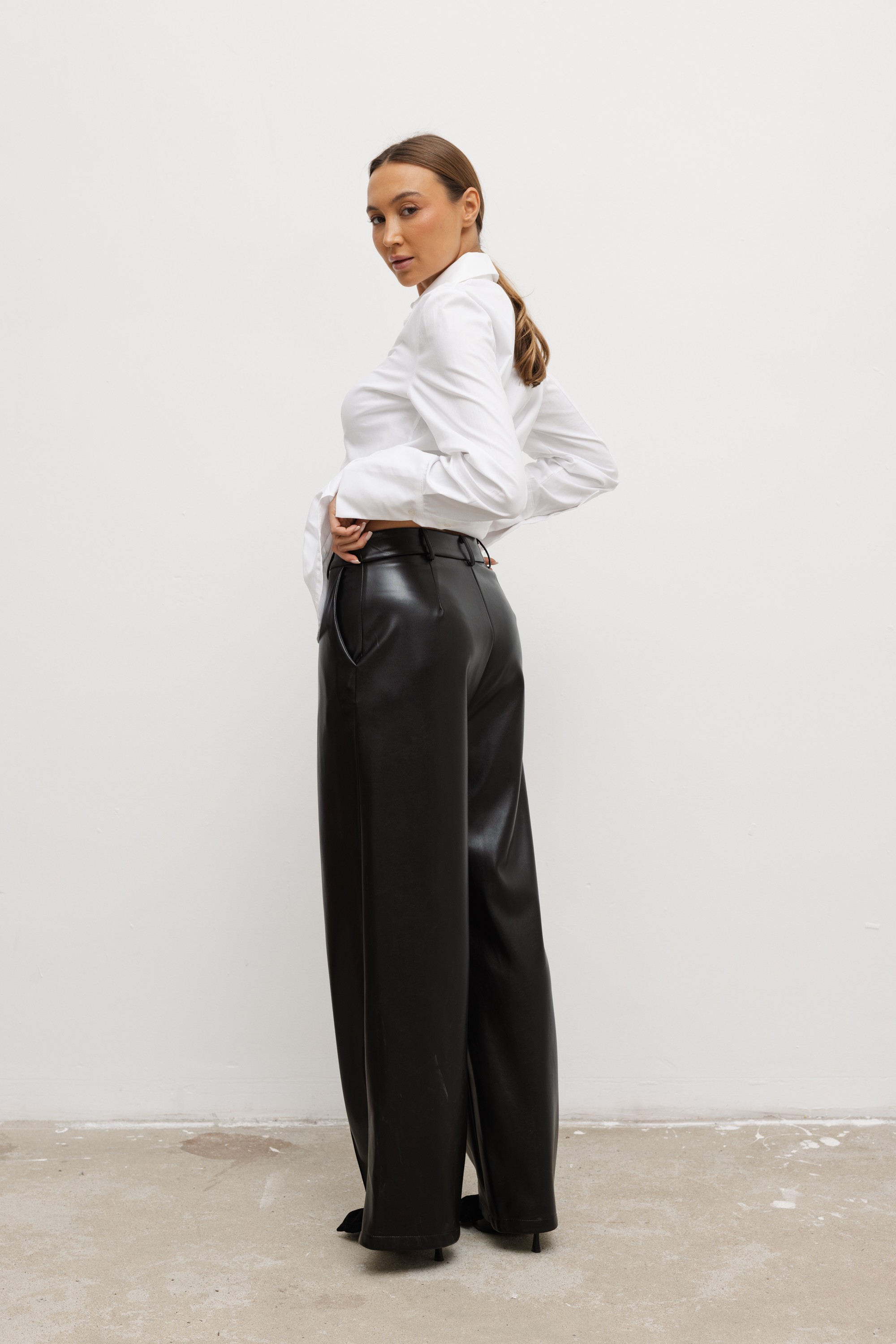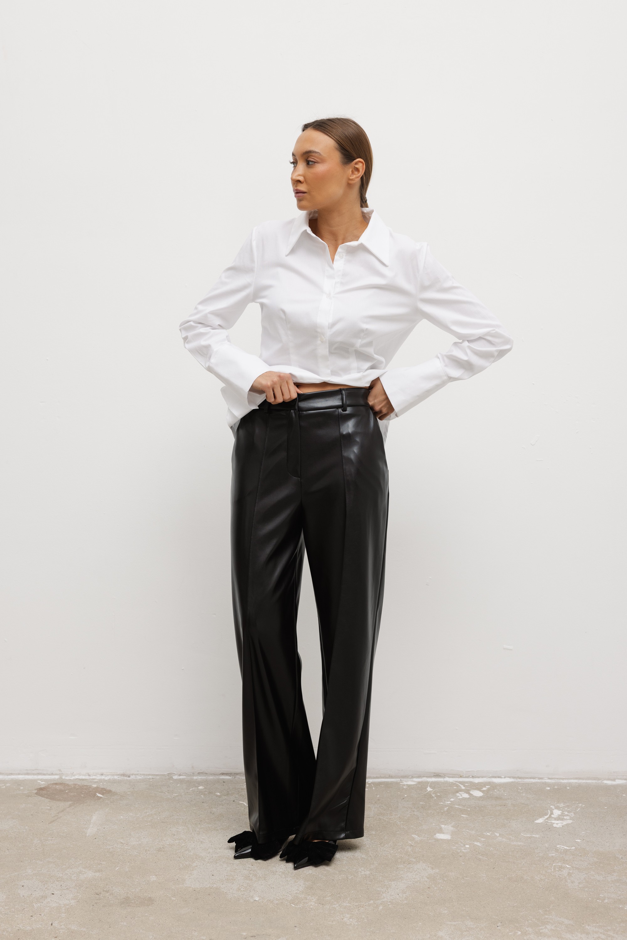 Spodnie z eko skóry o szerokiej nogawce i wysokim stanie, które łączą nowoczesny charakter z klasyczną linią. Pionowe przeszycie dodaje wyrazistego looku, a minimalistyczny krój sprawia, że świetnie komponują się zarówno z dopasowanymi, jak i oversize’owymi górami. Uniwersalny model, który podkreśla sylwetkę i dodaje stylizacjom odważnego akcentu.