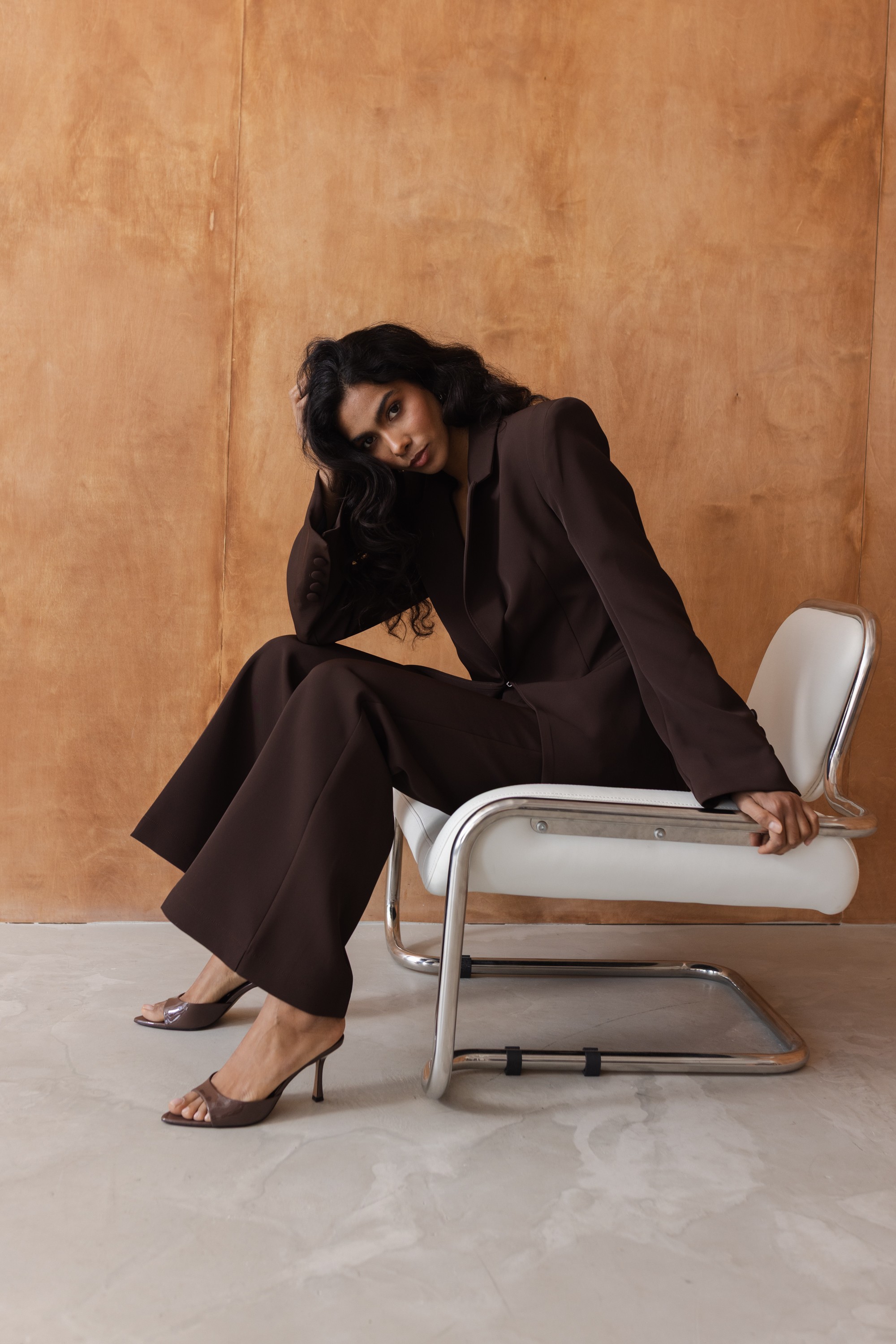 Gładka, lejąca tkanina doskonale układa się w ruchu, zapewniając komfort noszenia i elegancki wygląd przez cały dzień. Klasyczny odcień głębokiego brązu sprawia, że spodnie są ponadczasowe i łatwe do stylizacji – zarówno w zestawach biznesowych, jak i codziennych.